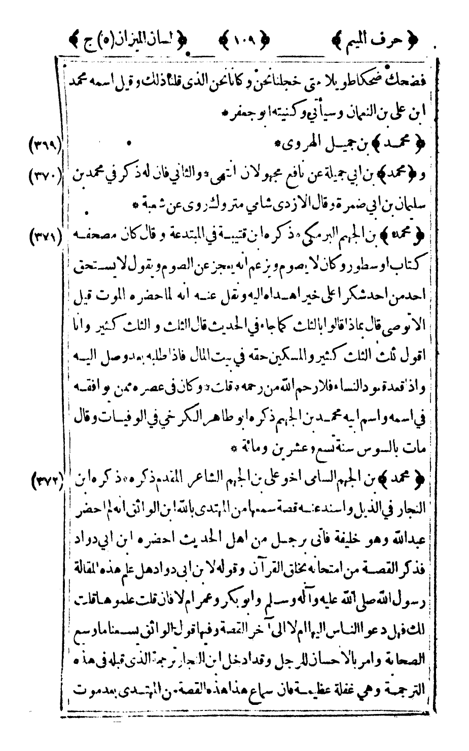372 - "محمد" بن الجهم السامي أخو علي بن الجهم الشاعر المقدم ذكره ذكره ابن النجار في الذيل وأسند عنه قصة سمعها من المهتدي بالله بن الواثق أنه لم احضر عبد الله وهو خليفة فاتى برجل من أهل الحديث أحضره بن أبي داود فذكر القصة من امتحانه بخلق القرآن وقوله لابن أبي داود هل علم هذه المقالة رسول الله صلى الله عليه وآله وسلم وأبو بكر وعمر أم لا فإن قلت: علموها قلت: لك فهل دعوا الناس إليها أم لا إلى آخر القصة وفيها قول الواثق يسعنا ما وسع الصحابة وأمر بالإحسان للرجل وقد ادخل بن النجار ترجمة الذي قبله في هذه الترجمة وهي غفلة عظيمة فإن سماع هذا هذه القصة من المهتدي بعد موت