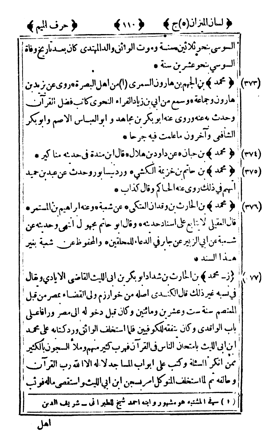376 - "محمد" بن الحارث بن وقدان العتكي عن شعبة وعنه إبراهيم بن المستمر قال العقيلي لا يتابع على إسناد حديثه وقال أبو حاتم مجهول انتهى وحديثه عن شعبة عن أبي الزبير عن جابر في الدعاء للمحلقين والمحفوظ عن شعبة بغير هذا السند.