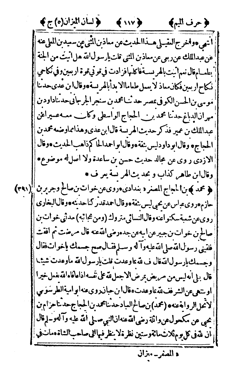 391 - "محمد" بن الحجاج المصغر 1بغدادي روى عن خوات بن صالح وجرير بن حازم روى عباس عن يحيى ليس بثقة وقال أحمد قد تركنا حديثه وقال البخاري روى عن شعبة سكتوا عنه وقال النسائي متروك ومن عجائبه حدثني خوات بن صالح بن خوات بن جبير عن أبيه عن جده رضى الله عنه قال مرضت ثم أفقت فلقيني رسول الله صلى الله عليه وآله وسلم فقال: صح جسمك يا خوات فقال: وجسمك يا رسول الله قال ف لله بما وعدت قلت: يا رسول الله ما وعدت شيئا قال بلى أنه ليس من مريض يمرض إلا جعل لله على نفسه إذا عافاه الله يفعل خيرا أو ينتهي عن الشر فف لله بما وعدت قال ابن حبان روى عنه أبو أمية الطرسوسي لا تحل الرواية عنه محمد بن صالح العباد حدثنا محمد بن الحجاج حدثنا حزام بن يحيى عن مكحول عن واثلة رضى الله عنه أن النبي صلى الله عليه وآله وسلم قال إن لله في كل يوم ثلاث مائة وستين نظرة لا ينظر فيها إلى صاحب الشاة مات في