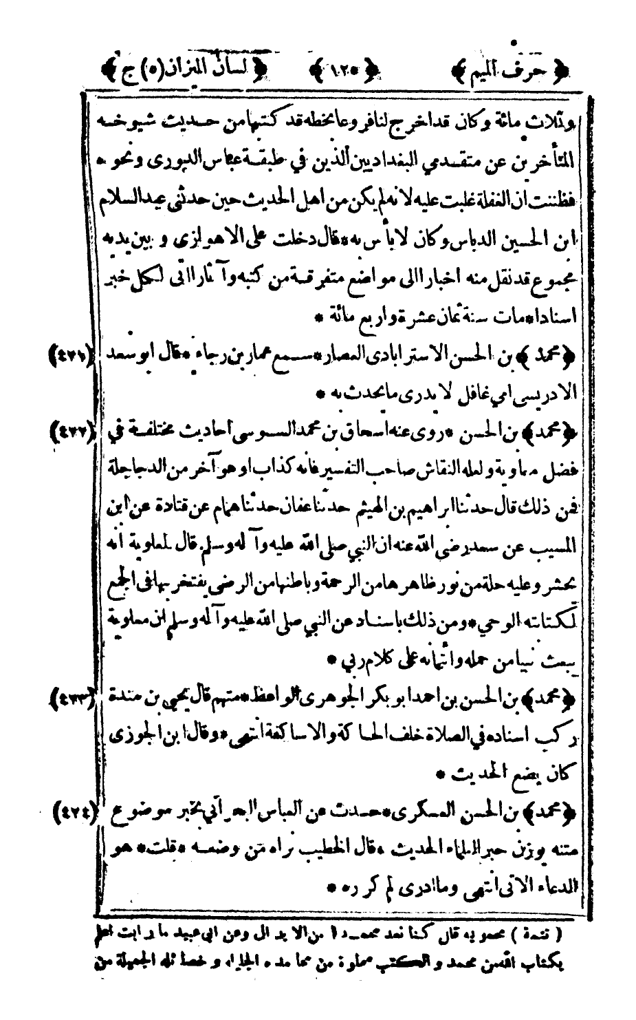 424 - "محمد" بن الحسن العسكري حدث عن العباس البحراني بخبر موضوع متنه يوزن حبر العلماء الحديث قال الخطيب نراه من وضعه قلت: هو الدعاء الآتي انتهى وما أدري لم كرره.