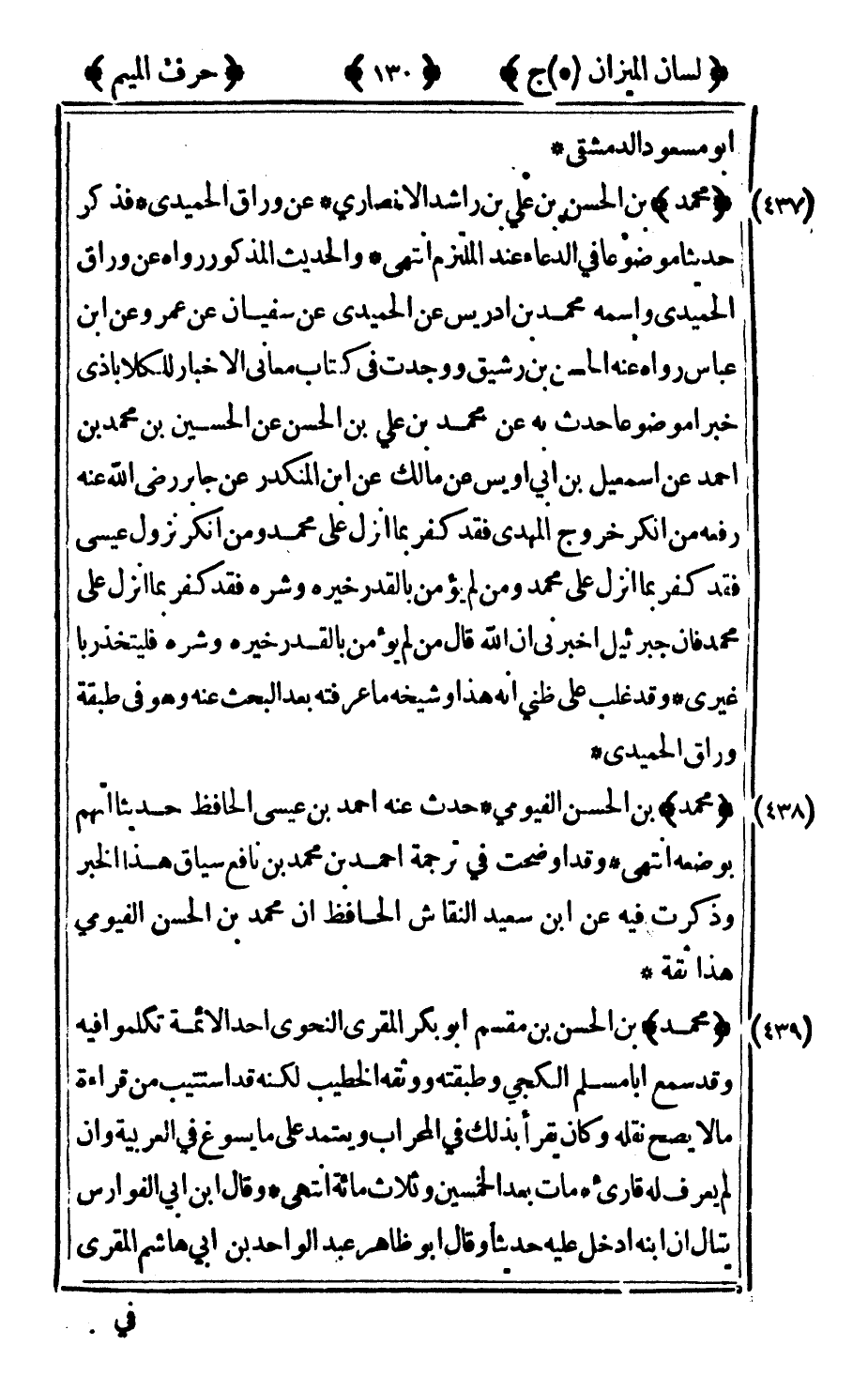 438 - "محمد" بن الحسن الفيومي حدث عنه أحمد بن عيسى الحافظ حديثا اتهم بوضعه انتهى وقد أوضحت في ترجمة أحمد بن محمد بن نافع سياق هذا الخبر وذكرت فيه عن ابن سعيد النقاش الحافظ أن محمد بن الحسن الفيومي هذا ثقة.