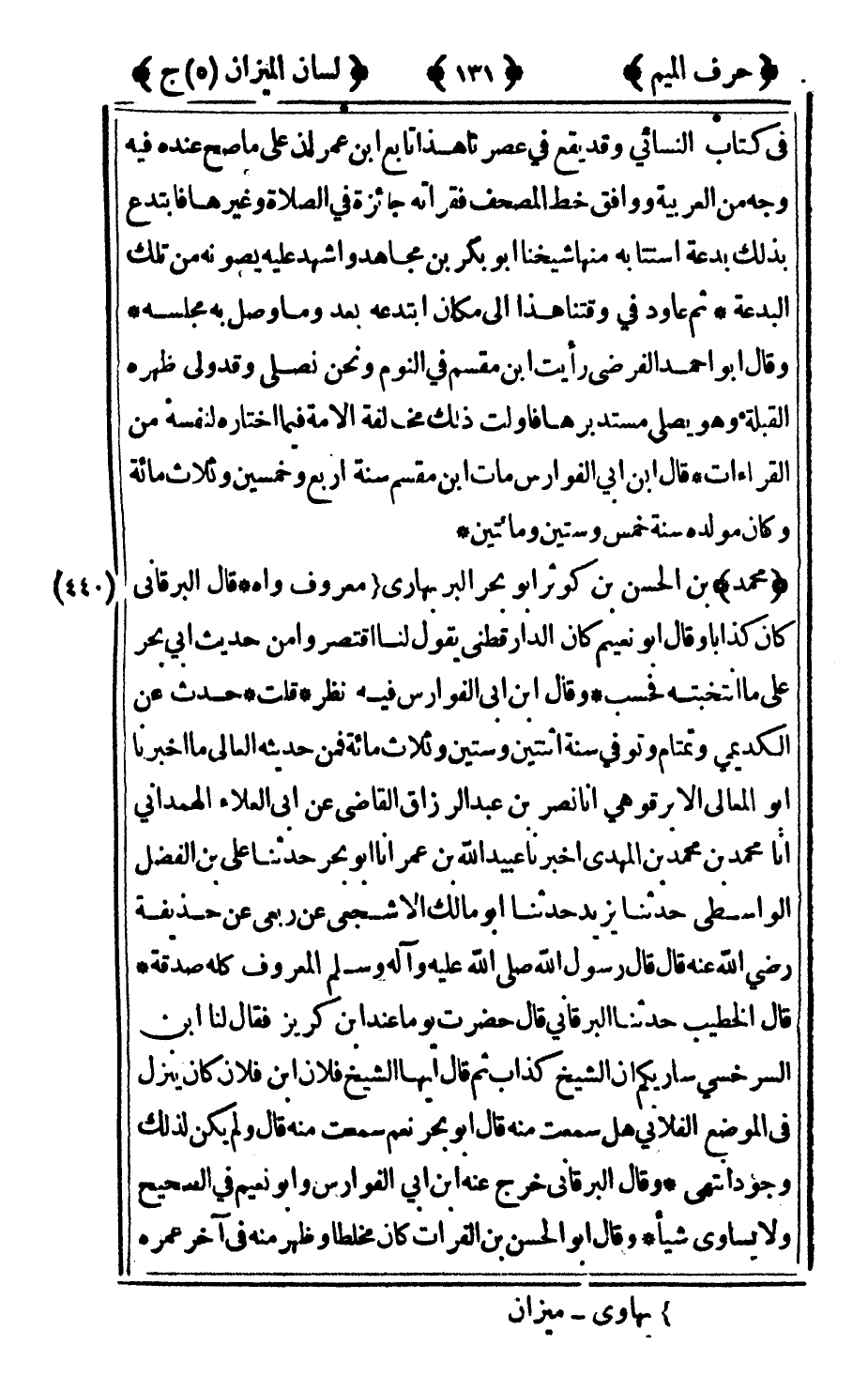 440 - "محمد" بن الحسن بن كوثر أبو بحر البربهاري 1معروف واه قال البرقاني كان كذابا وقال أبو نعيم كان الدارقطني يقول: لنا اقتصروا من حديث أبي بحر على ما انتخبته فحسب وقال ابن أبي الفوارس فيه نظر قلت: حدث عن الكديمي وتمتام وتوفي سنة اثنتين وستين وثلاث مائة فمن حديثه العالي ما أخبرنا أبو المعالي الأبرقوهي أنا نصر بن عبد الرزاق القاضي عن أبي العلاء الهمداني أنا محمد بن محمد بن المهدي أخبرنا عبيد الله بن عمر أنا أبو بحر حدثنا علي بن الفضل الواسطي حدثنا يزيد حدثنا أبو مالك الأشجعي عن ربعي عن حذيفة رضى الله عنه قال: قال رسول الله صلى الله عليه وآله وسلم المعروف كله صدقة قال الخطيب حدثنا البرقاني قال حضرت يوما عند بن كريز فقال لنا بن السرخسي: سأريكم أن الشيخ كذاب ثم قال أيها الشيخ فل أن ابن فلان كان ينزل في الموضع الفلاني هل سمعت منه قال أبو بحر نعم سمعت منه قال ولم يكن لذلك وجود انتهى وقال البرقاني خرج عنه ابن أبي الفوارس وأبو نعيم في الصحيح ولا يساوي شيئا وقال أبو الحسن بن الفرات كان مخلطا وظهر منه في آخر عمره