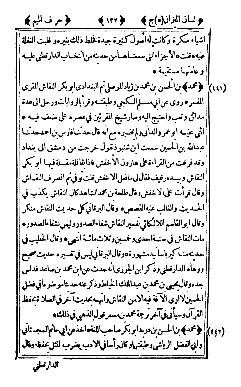 441 - "محمد" بن الحسن بن محمد بن زياد الوصلي ثم البغدادي أبو بكر النقاش المقرى المفسر روى عن أبي مسلم الكجي وطبقته وقرأ بالروايات ورحل إلى عدة مدائن وتعب واحتيج إليه وصار شيخ المقرئين في عصره على ضعف فيه اثنى عليه أبو عمرو الداني ولم يخبره مع أنه قال حدثنا فارس بن أحمد حدثنا عبد الله بن الحسين سمعت ابن شنبوذ يقول: خرجت من دمشق إلى بغداد وقد فرغت من القراءة على هارون الأخفش فإذا بقافلة مقبلة فيها أبو بكر النقاش وبيده رغيف فقال لي: ما فعل الأخفش قلت: توفي ثم انصرف النقاش وقال قرأت على الأخفش وقال طلحة بن محمد الشاهد كان النقاش يكذب في الحديث والغالب عليه القصص وقال البرقاني كل حديث النقاش منكر وقال أبو القاسم اللالكائي تفسير النقاش شفاء الصدور وليس بشفاء الصدور مات النقاش في سنة إحدى وخمسين وثلاث مائة انتهى وقال الخطيب في حديثه مناكير بأسانيد مشهورة وقال البرقاني ليس في تفسيره حديث صحيح ووهاه الدارقطني وذكر بن الجوزي أنه حدث عن ابن محمد بن صاعد فدلس جده وقال يحيى بن محمد بن عبد الملك الخياط وذكر عنه حديثا موضوعا في فضل الحسين لا أرى الآفة فيه إلا من النقاش واتهمه بحديث آخر في الصلاة بحفظ القرآن وسيأتي في آخر ترجمة محمد بن مسعر قول الذهبي في ذلك.