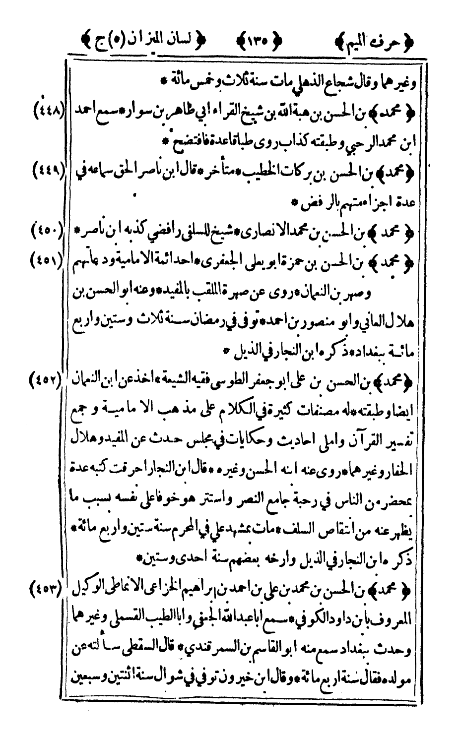 452 - "محمد" بن الحسن بن علي أبو جعفر الطوسي فقيه الشيعة أخذ عن ابن النعمان أيضا وطبقته له مصنفات كثيرة في الكلام على مذهب الإمامية وجمع تفسير القرآن وأملى أحاديث وحكايات في مجلس حدث عن المفيد وهلال الحفار وغيرهما روى عنه ابنه الحسن وغيره قال ابن النجار احرقت كتبه عدة بمحضر من الناس في رحبة جامع النصر واستتر هو خوفا على نفسه بسبب ما يظهر عنه من انتقاص السلف مات بمشهد علي في المحرم سنة ستين وأربع مائة ذكره ابن النجار في الذيل وأرخه بعضهم سنة إحدى وستين.