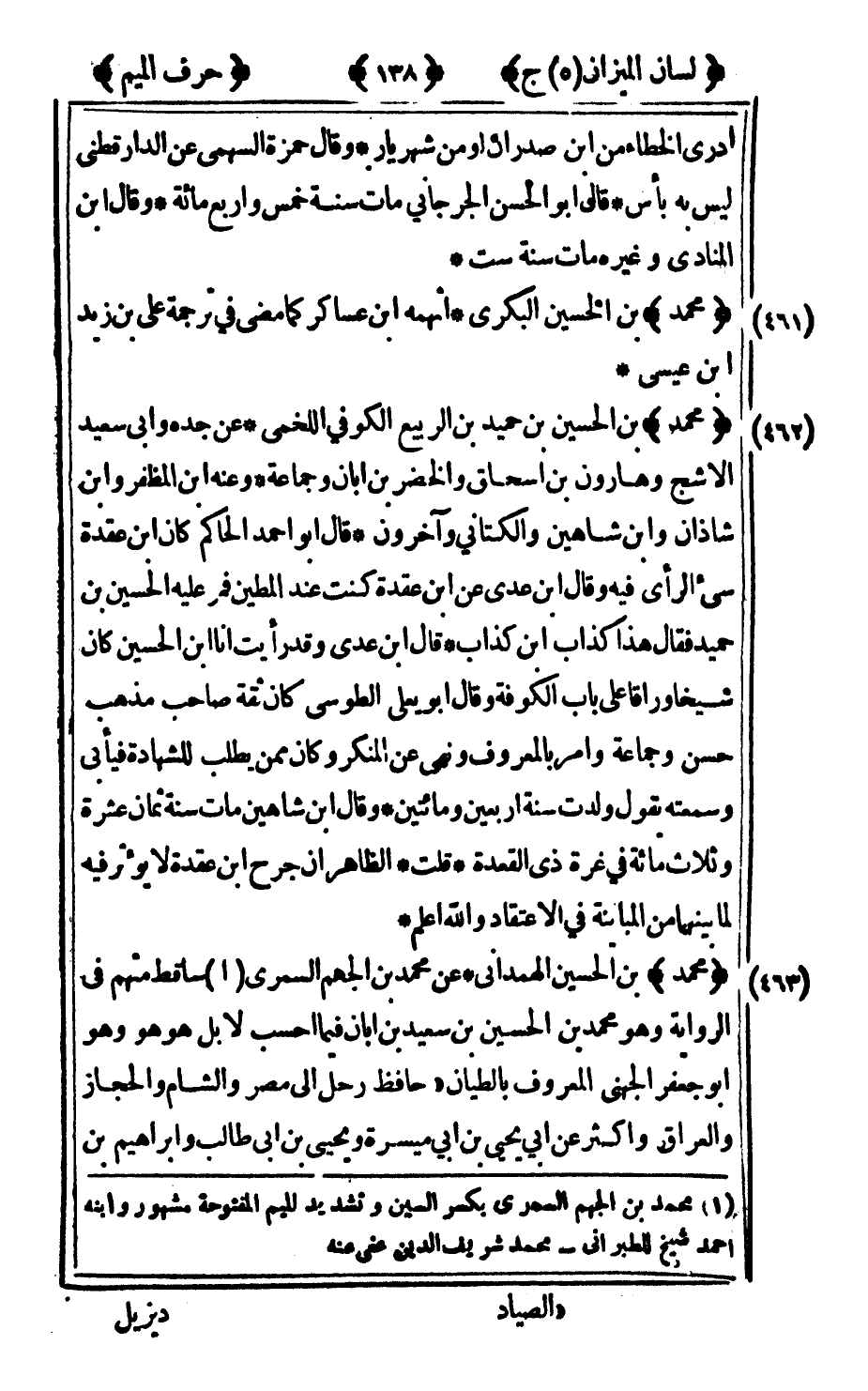 463 - "محمد" بن الحسين الهمداني عن محمد بن الجهم السمري1 ساقط متهم في الرواية وهو محمد بن الحسين بن سعيد بن أبان فيما احسب لا بل هو هو وهو أبو جعفر الجهني المعروف بالطيان 2حافظ رحل إلى مصر والشام والحجاز والعراق وأكثر عن أبي يحيى بن أبي ميسرة ويحيى بن أبي طالب وإبراهيم بن