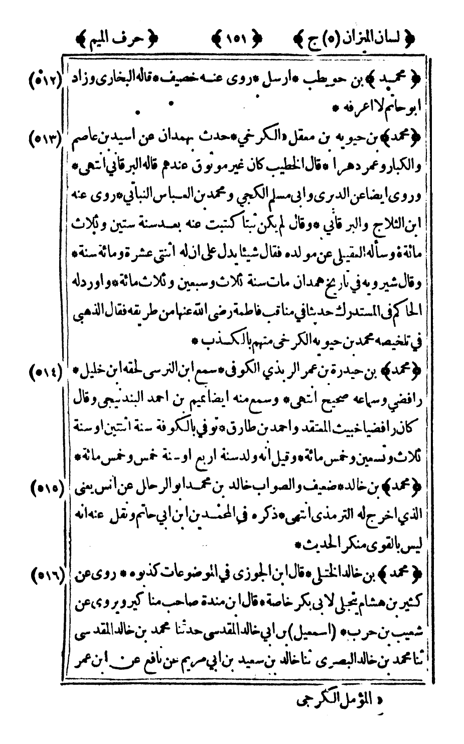 514 - "محمد" بن حيدرة بن عمر الربذي الكوفي سمع بن النرسي لحقه بن خليل رافضي وسماعه صحيح انتهى وسمع منه أيضا تميم بن أحمد البندنيجي وقال كان رافضيا خبيث المعتقد وأحمد بن طارق توفي بالكوفة سنة اثنتين أو سنة ثلاث وتسعين وخمس مائة وقيل إنه ولد سنة أربع أو سنة خمس وخمس مائة.