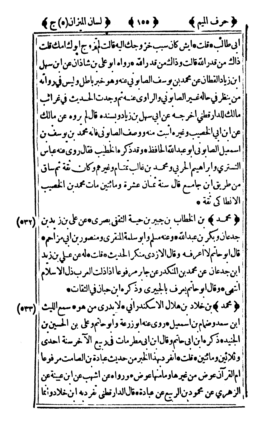 532 - "محمد" بن الخطاب بن جبير بن حية الثقفي بصري عن علي بن زيد بن جدعان وبكر بن عبد الله وعنه مسلم وأبو سلمة المنقري ومنصور بن أبي مزاحم قال أبو حاتم لا أعرفه وقال الأزدي منكر الحديث قلت: له عن علي بن زيد بن جدعان عن محمد بن المنكدر عن جابر مرفوعا إذا ذلت العرب ذل الإسلام انتهى وقال أبو حاتم يعرف بالجبيري وذكره ابن حبان في الثقات.
