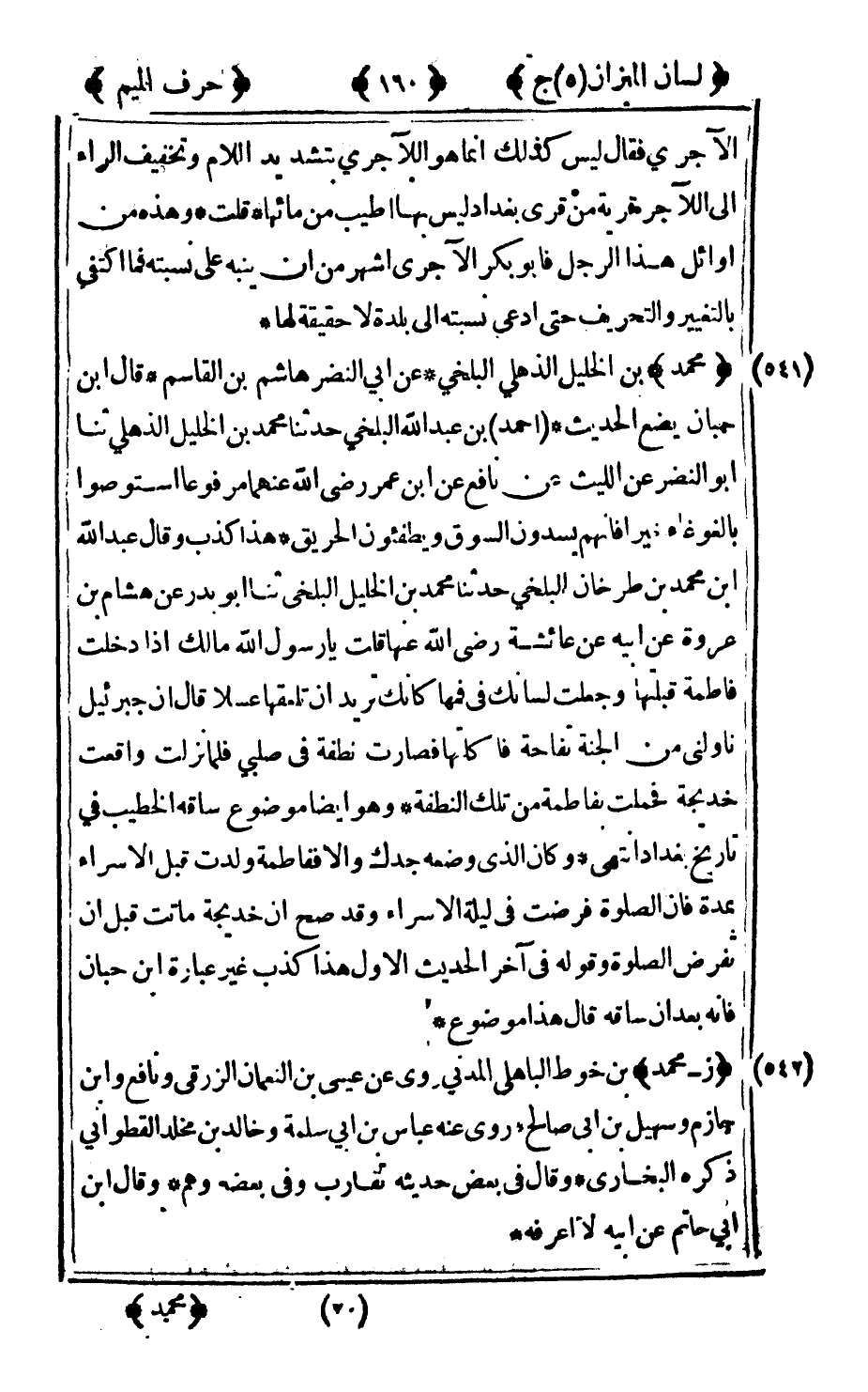 541 - "محمد" بن الخليل الذهلي البلخي عن أبي النضر هاشم بن القاسم قال ابن حبان يضع الحديث أحمد بن عبد الله البلخي حدثنا محمد بن الخليل الذهلي ثنا أبو النضر عن الليث عن نافع عن ابن عمر رضى الله عنهما مرفوعا استوصوا بالغوغاء خيرا فانهم يسدون السوق ويطفئون الحريق هذا كذب وقال عبد الله بن محمد بن طرخان البلخي حدثنا محمد بن الخليل البلخي ثنا أبو بدر عن هشام بن عروة عن أبيه عن عائشة رضى الله عنها قلت: يا رسول الله ما لك إذا دخلت فاطمة قبلتها وجعلت لسانك في فمها كأنك تريد أن تلعقها عسلا قال إن جبرائيل ناولني من الجنة تفاحة فاكلتها فصارت نطفة في صلبي فلما نزلت واقعت خديجة فحملت بفاطمة من تلك النطفة وهو أيضا موضوع ساقه الخطيب في تاريخ بغداد انتهى وكان الذي وضعه جدك والا ففاطمة ولدت قبل الإسراء بمدة فإن الصلاة فرضت في ليلة الإسراء وقد صح أن خديجة ماتت قبل أن تفرض الصلاة وقوله في آخر الحديث الأول هذا كذب غير عبارة بن حبان فإنه بعد أن ساقه قال هذا موضوع.