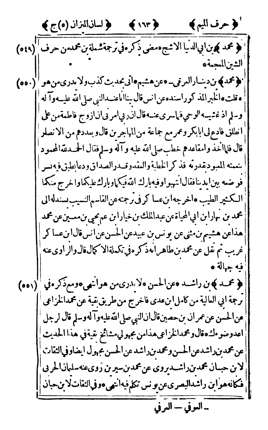 551 - "محمد" بن راشد عن الحسن لا يدري من هو انتهى ومع ذكره في ترجمة أبي العالية من كامل بن عدي فاخرج من طريق بقية عن محمد الخزاعي عن الحسن عن عمر أن ابن حصين قال إن النبي صلى الله عليه وآله وسلم قال لرجل أعد وضوءك قال ومحمد الخزاعي هذا من مجهولي مشائخ بقية في هذا الحديث عن محمد بن راشد عن الحسن ومحمد بن راشد عن الحسن مجهول أيضا وفي الثقات لابن حبان محمد بن راشد يروي عن محمد بن سيرين روى عنه سليمان الحربي فكأنه هو ابن راشد البصري عن يونس تكلم فيه انتهى وفي الثقات لابن حبان1