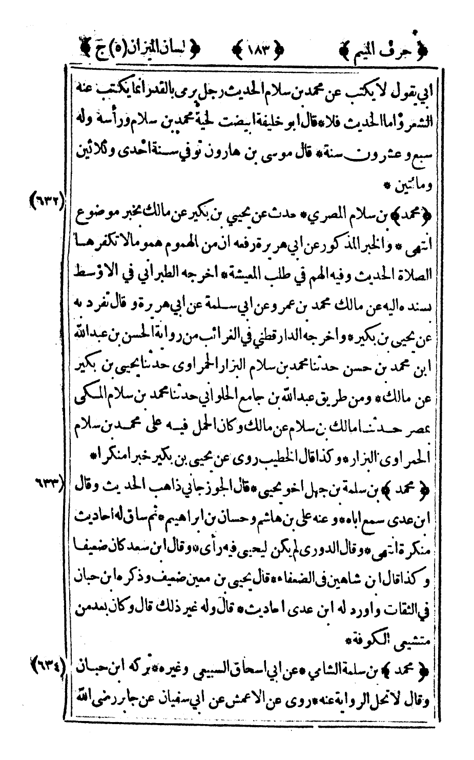 634 - "محمد" بن سلمة الشامي عن أبي إسحاق السبيعي وغيره تركه بن حبان وقال: لا تحل الرواية عنه روى عن الأعمش عن أبي سفيان عن جابر رضى الله