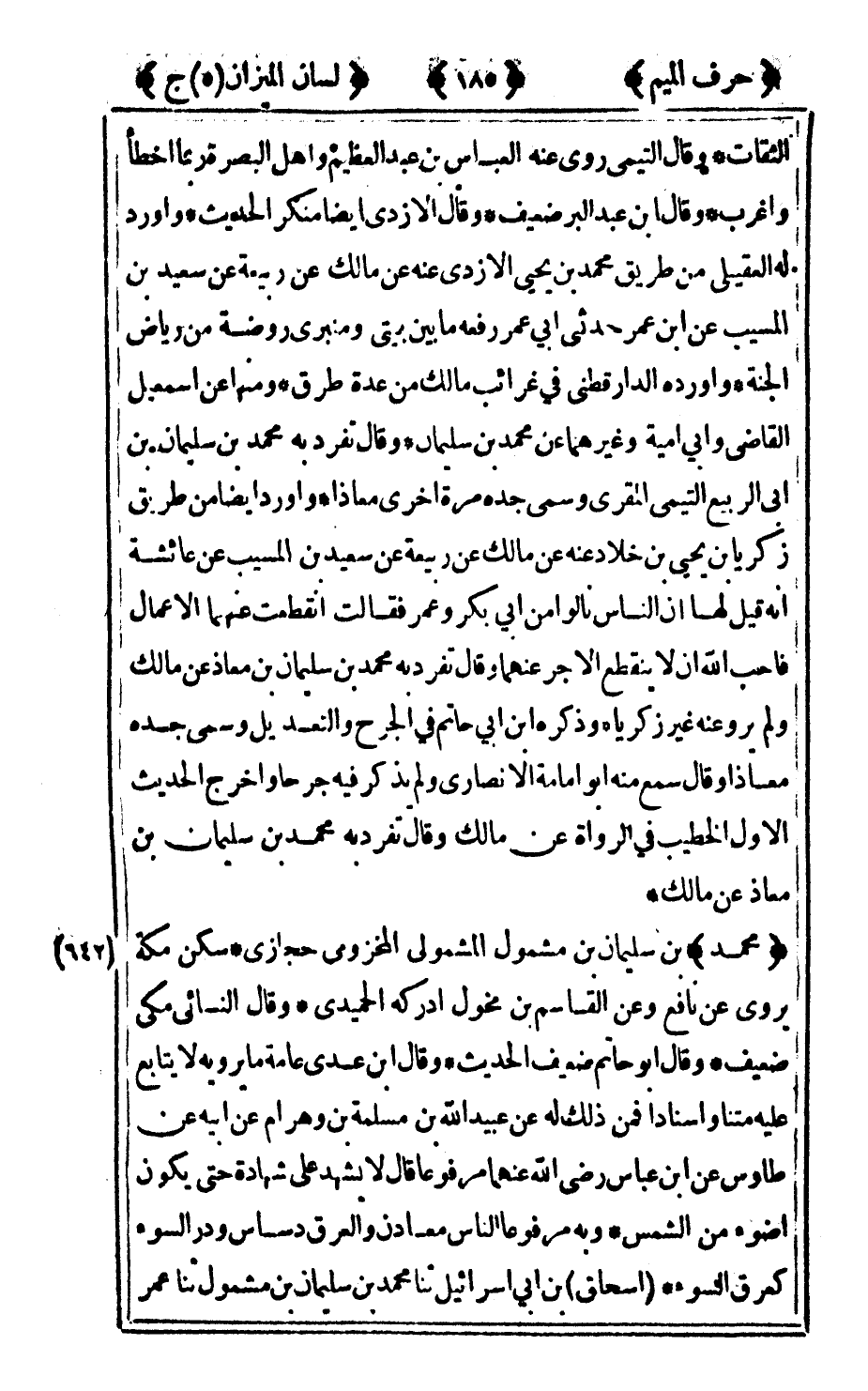642 - "محمد" بن سليمان ابن مشمول المشمولي المخزومي حجازي سكن مكة يروي عن نافع وعن القاسم بن مخول أدركه الحميدي وقال النسائي مكي ضعيف وقال أبو حاتم ضعيف الحديث وقال ابن عدي: عامة ما يرويه لا يتابع عليه متنا واسنادا فمن ذلك له عن عبيد الله بن مسلمة بن وهرام عن أبيه عن طاوس عن ابن عباس رضى الله عنهما مرفوعا قال: لا يشهد على شهادة حتى يكون اضوء من الشمس وبه مرفوعا الناس معادن والعرق دساس ودر السوء كعرق السوء إسحاق بن أبي إسرائيل ثنا محمد بن سليمان ابن مشمول ثنا عمر