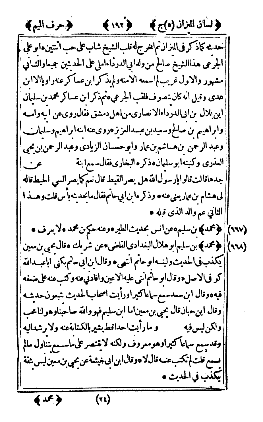 668 - "محمد" بن سليم أبو هلال البغدادي القاضي عن شريك قال يحيى بن معين يكذب في الحديث ولينه أبو حاتم انتهى وقال ابن أبي حاتم يكنى أبا عبد الله كوفي الأصل وقال أبو حاتم اثنى عليه الأعين وأفادني عنه وكتب عنه على ضعفه فيه وقال ابن سعد سمع سماعا كثيرا ورأيت أصحاب الحديث يتبعون حديثه وقال ابن حبان قال يحيى بن معين أما بن سليم فهو والله صاحبنا وهو لنا محب ولكن ليس فيه وما رأيت أحدا قط يشير بالكتابة عنه ولا يرشد إليه وقد سمع سماعا كثيرا وهو معروف ولكنه لا يقتصر على ما سمع بتناول ما لم يسمع قلت: لم تكتب عنه قال: لا وقال ابن أبي خيثمة عن يحيى بن معين ليس بثقة يكذب في الحديث.