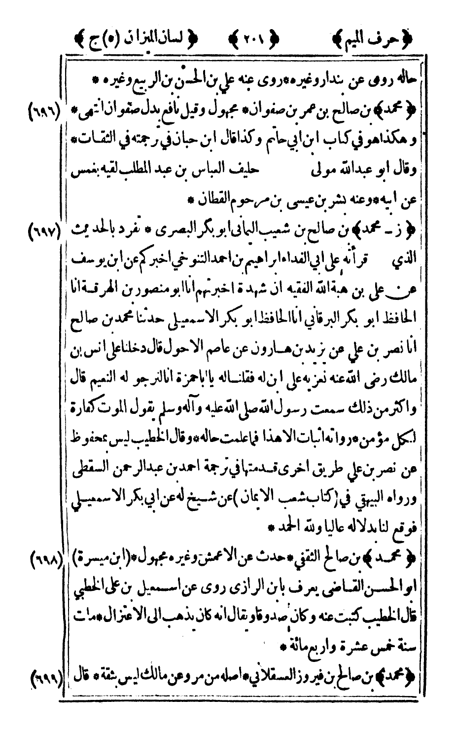 698 - "محمد" بن صالح الثقفي حدث عن الأعمش وغيره مجهول بن ميسرة أبو الحسن القاضي يعرف بابن الرازي روى عن إسماعيل بن علي الخطبي قال الخطيب كتبت عنه وكان صدوقا ويقال إنه كان يذهب إلى الاعتزال مات سنة خمس عشرة وأربع مائة.