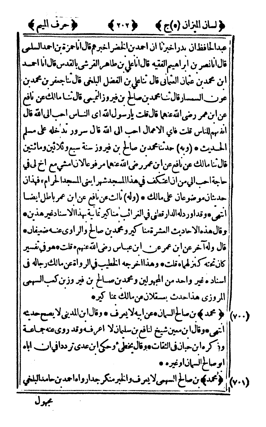 700 - "محمد" بن صالح السمان عن أبيه لا يعرف وقال ابن المديني لا يصح حديثه انتهى وقال ابن معين شيخ لنافع بن سليمان لا أعرفه وقد روى عنه جماعة وذكره ابن حبان في الثقات وقال يخطىء وحكى بن عدي ترددا في أن أباه أبو صالح السمان أو غيره.
