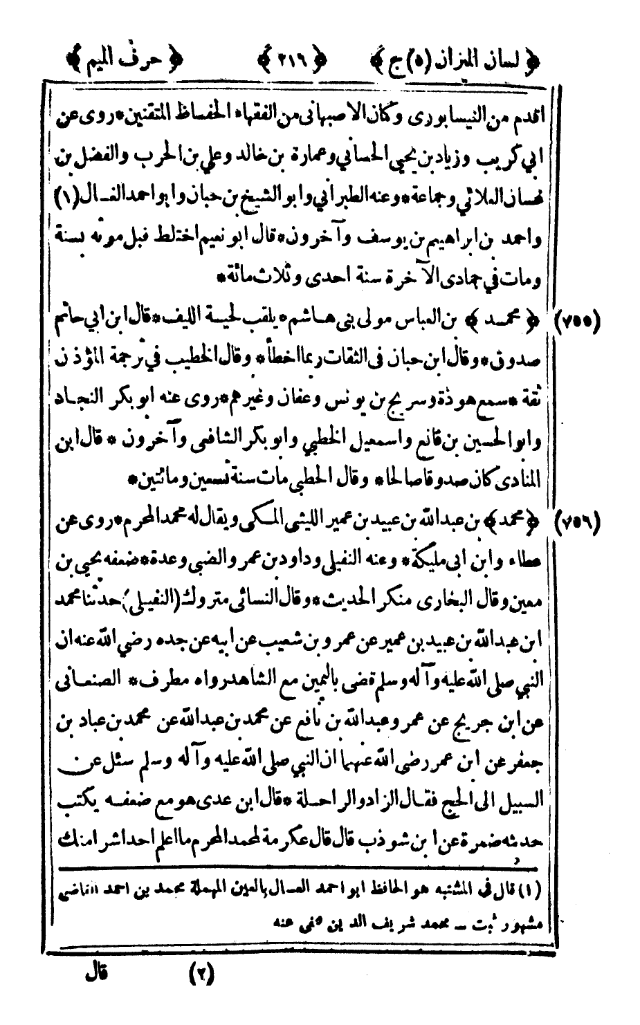 755 - "محمد" بن العباس مولى بني هاشم يلقب لحية الليف قال ابن أبي حاتم صدوق وقال ابن حبان في الثقات ربما أخطأ وقال الخطيب في ترجمة المؤذن ثقة سمع هوذة وسريج بن يونس وعفإن وغيرهم روى عنه أبو بكر النجاد وأبو الحسين بن قانع وإسماعيل الخطبي وأبو بكر الشافعي وآخرون قال ابن المنادي كان صدوقا صالحا وقال الحطبي مات سنة تسعين ومائتين.