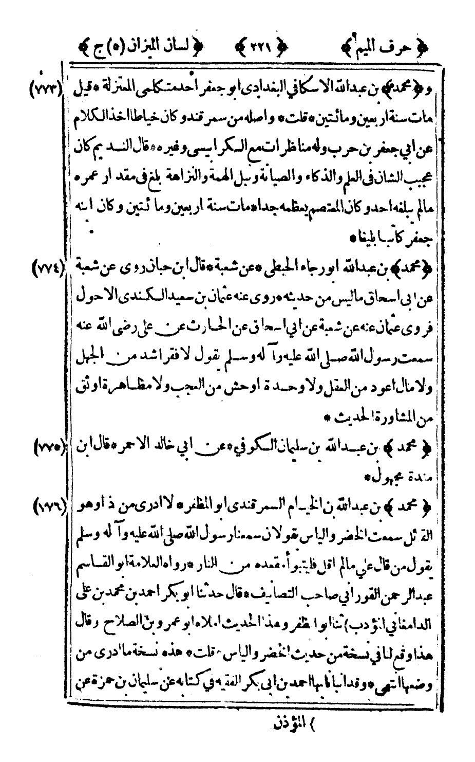 775 - "محمد" بن عبد الله بن سليمان الكوفي عن أبي خالد الأحمر قال ابن مندة: مجهول.