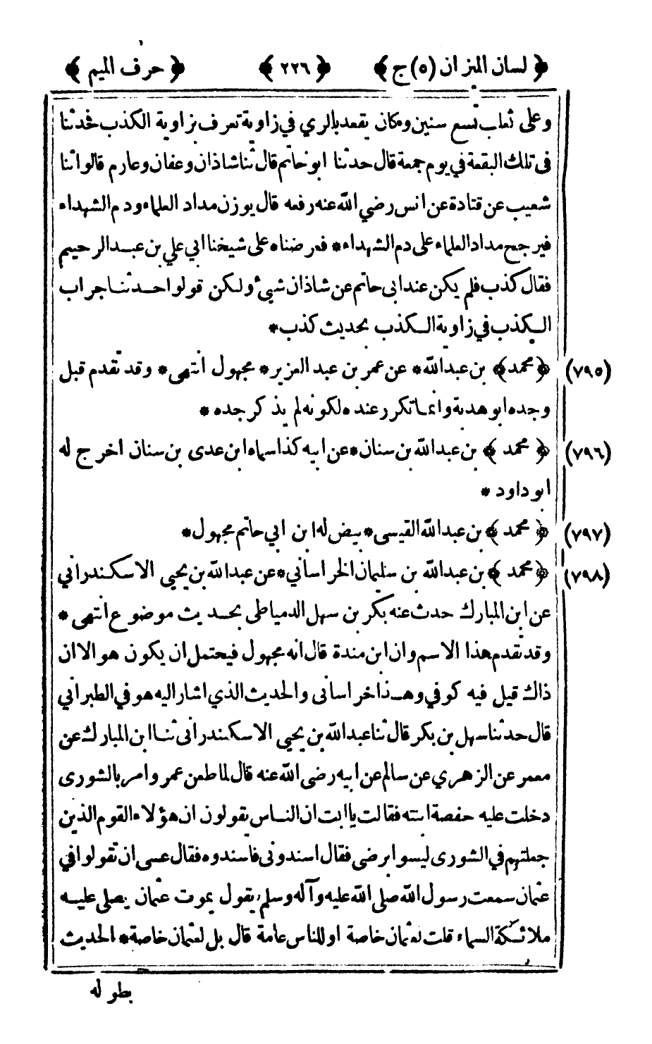 795 - "محمد" بن عبد الله عن عمر بن عبد العزيز مجهول انتهى وقد تقدم قبل وجده أبو هدبة وإنما تكرر عنده لكونه لم يذكر جده.