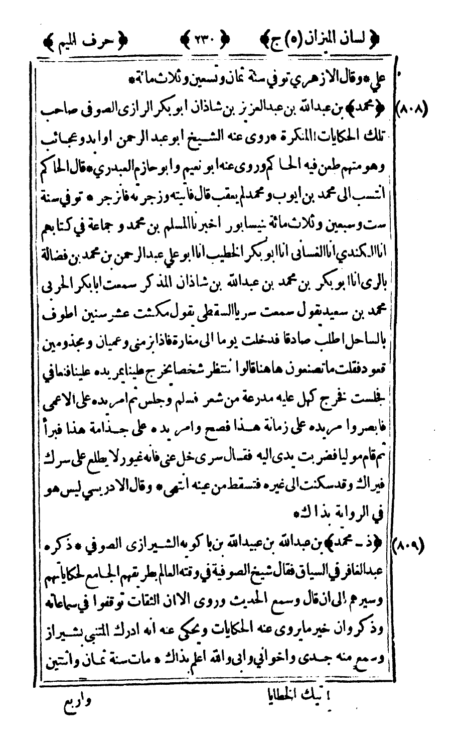 809 - "ذ - محمد" بن عبد الله بن عبيد الله بن باكويه الشيرازي الصوفي ذكره عبد الغافر في السياق فقال شيخ: الصوفية في وقته العالم بطريقهم الجامع لحكاياتهم وسيرهم إلى أن قال وسمع الحديث وروى إلا أن الثقات توقفوا في سماعاته وذكر وإن خير ما يروى عنه الحكايات ويحكى عنه أنه أدرك المتنبي بشيراز وسمع منه جدي وأخواني وأبي والله أعلم بذاك مات سنة ثمان واثنتين1