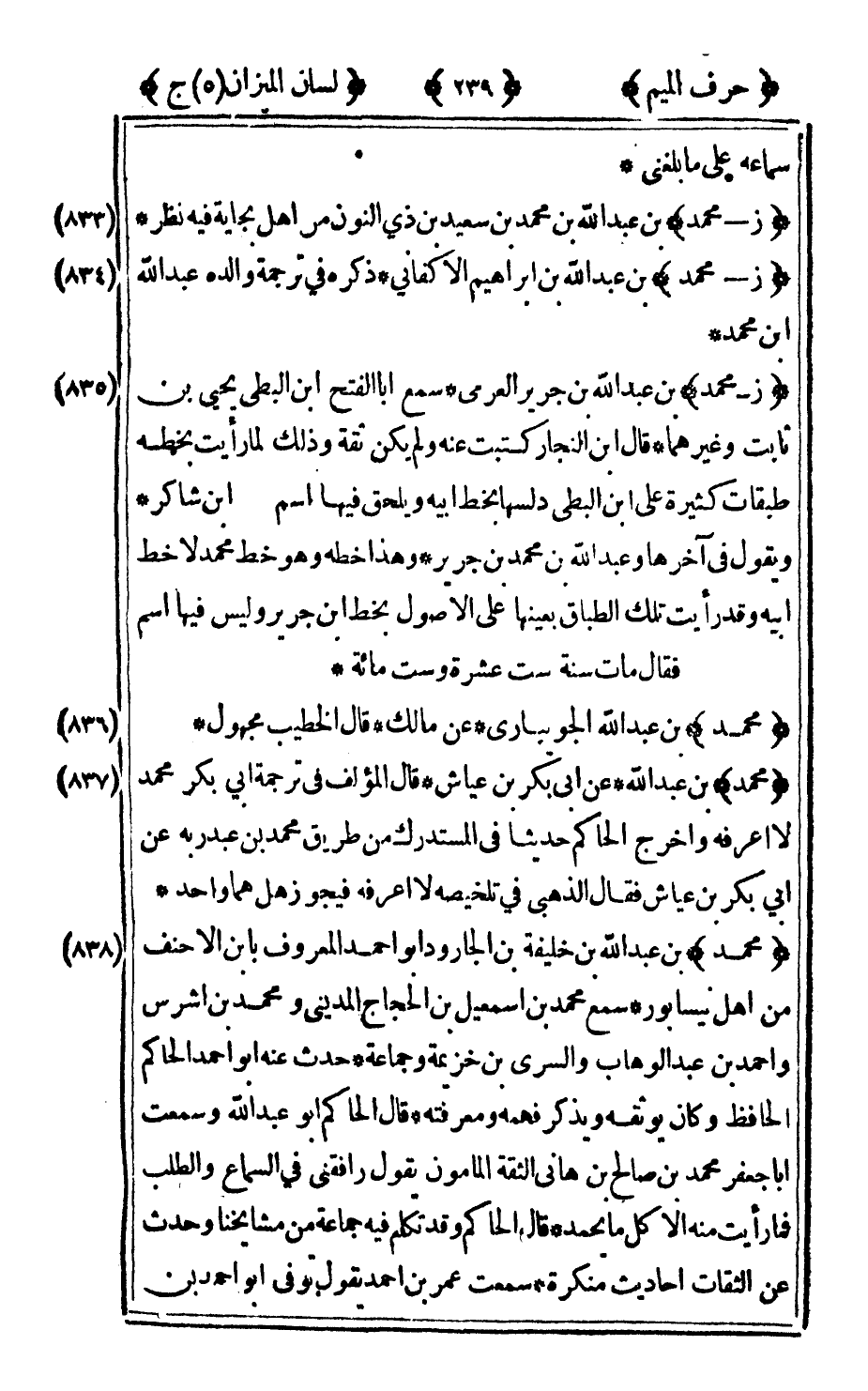 837 - "محمد" بن عبد الله عن أبي بكر بن عياش قال المؤلف في ترجمة أبي بكر محمد لا أعرفه وأخرج الحاكم حديثا في المستدرك من طريق محمد بن عبد ربه عن أبي بكر بن عياش فقال الذهبي في تلخيصه: لا أعرفه فيجوز هل هما واحد.