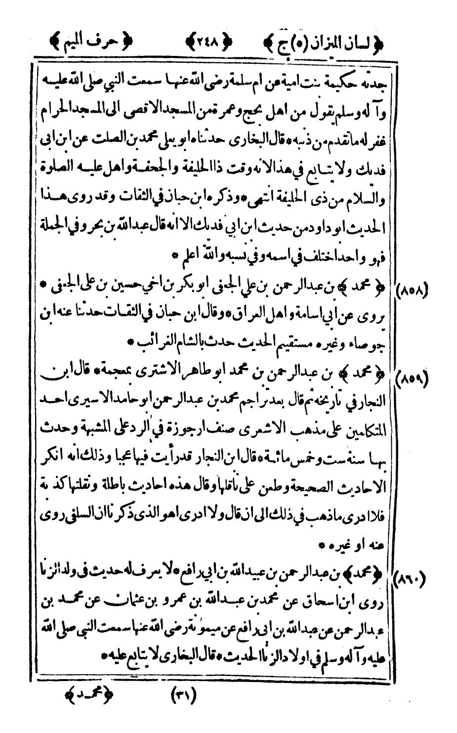 859 - "محمد" بن عبد الرحمن بن محمد أبو طاهر الأشتري بمعجمة قال ابن النجار في تاريخه ثم قال بعد تراجم محمد بن عبد الرحمن أبو حامد الأسيري أحد المتكلمين على مذهب الأشعري صنف أرجوزة في الرد على المشبهة وحدث بها سنة ست وخمس مائة قال ابن النجار قد رأيت فيها عجبا وذلك أنه أنكر الأحاديث الصحيحة وطعن على ناقلها وقال هذه أحاديث باطلة ونقلتها كذبة فلا أدري ما ذهب في ذلك إلى أن قال ولا أدري أهو الذي ذكرنا أن السلفي روى عنه أو غيره.
