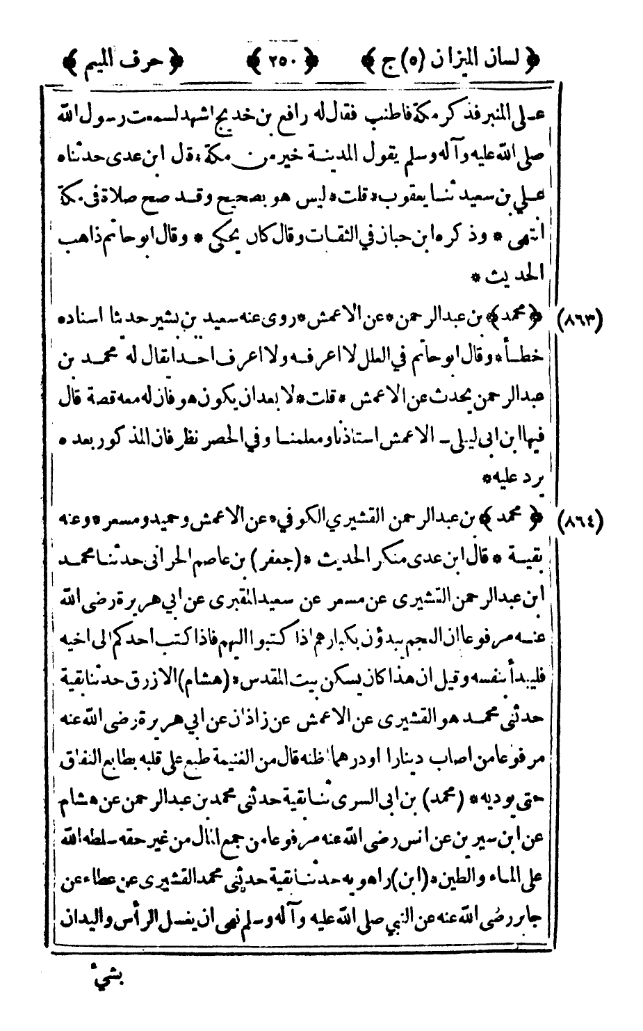 863 - "محمد" بن عبد الرحمن عن الأعمش روى عنه سعيد بن بشير حديثا إسناده خطأ وقال أبو حاتم في العلل لا أعرفه ولا أعرف أحدا يقال له محمد بن عبد الرحمن يحدث عن الأعمش قلت: لا بعد أن يكون هو فإن له معه قصة قال فيها بن أبي ليلى الأعمش استاذنا ومعلمنا وفي الحصر نظر فإن المذكور بعده يرد عليه.