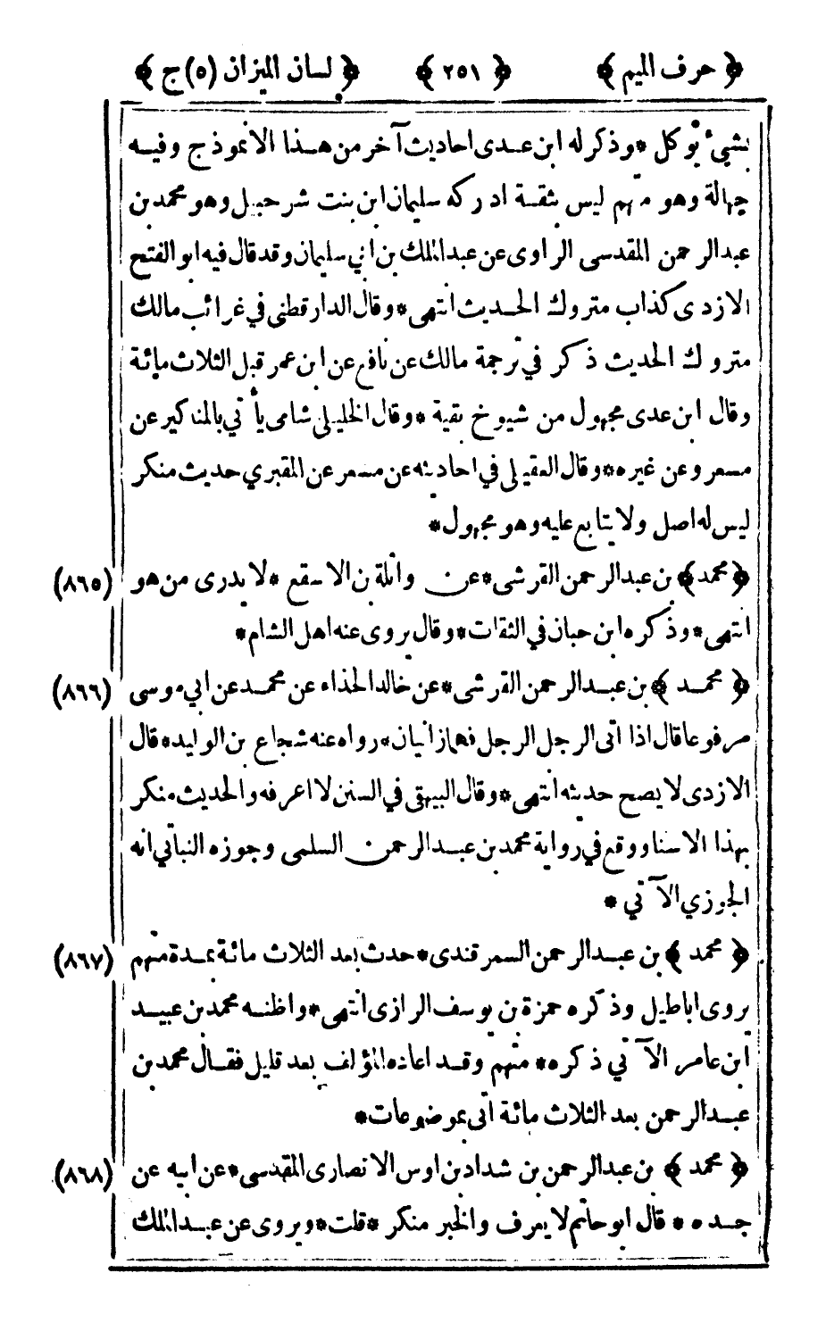 867 - "محمد" بن عبد الرحمن السمرقندي حدث بعد الثلاث مائة بمدة متهم يروي أباطيل وذكره حمزة بن يوسف الرازي انتهى وأظنه محمد بن عبيد بن عامر الآتي ذكره متهم وقد أعاده المؤلف بعد قليل فقال محمد بن عبد الرحمن بعد الثلاث مائة اتى بموضوعات.