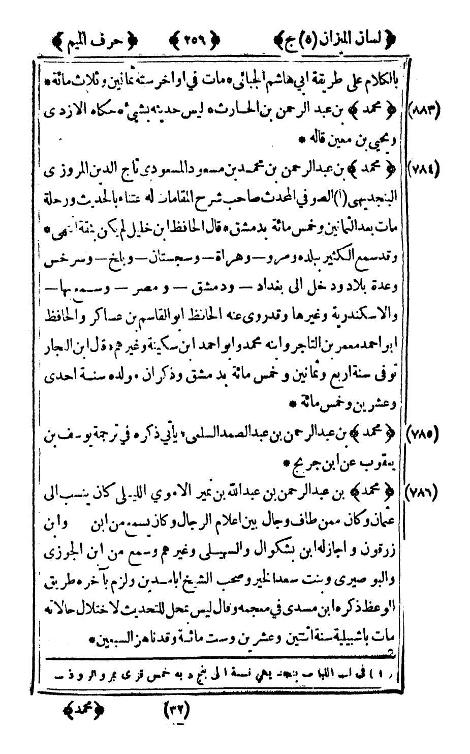 886 - "محمد" بن عبد الرحمن بن عبد الله بن نمير الأموي الليلي كان ينسب إلى عثمان وكان ممن طاف وجال بين اعلام الرجال وكان يسمع من بن وابن زرقون وأجاز له ابن بشكوال والسهيلي وغيرهم وسمع من بن الجوزي والبوصيري وبنت سعد الخير وصحب الشيخ أبا مدين ولزم بآخره طريق الوعظ ذكره ابن مسدي في معجمه وقال ليس بمحل للتحديث لاختلال حالاته مات بإشبيلية سنة اثنتين وعشرين وست مائة وقد ناهز السبعين.