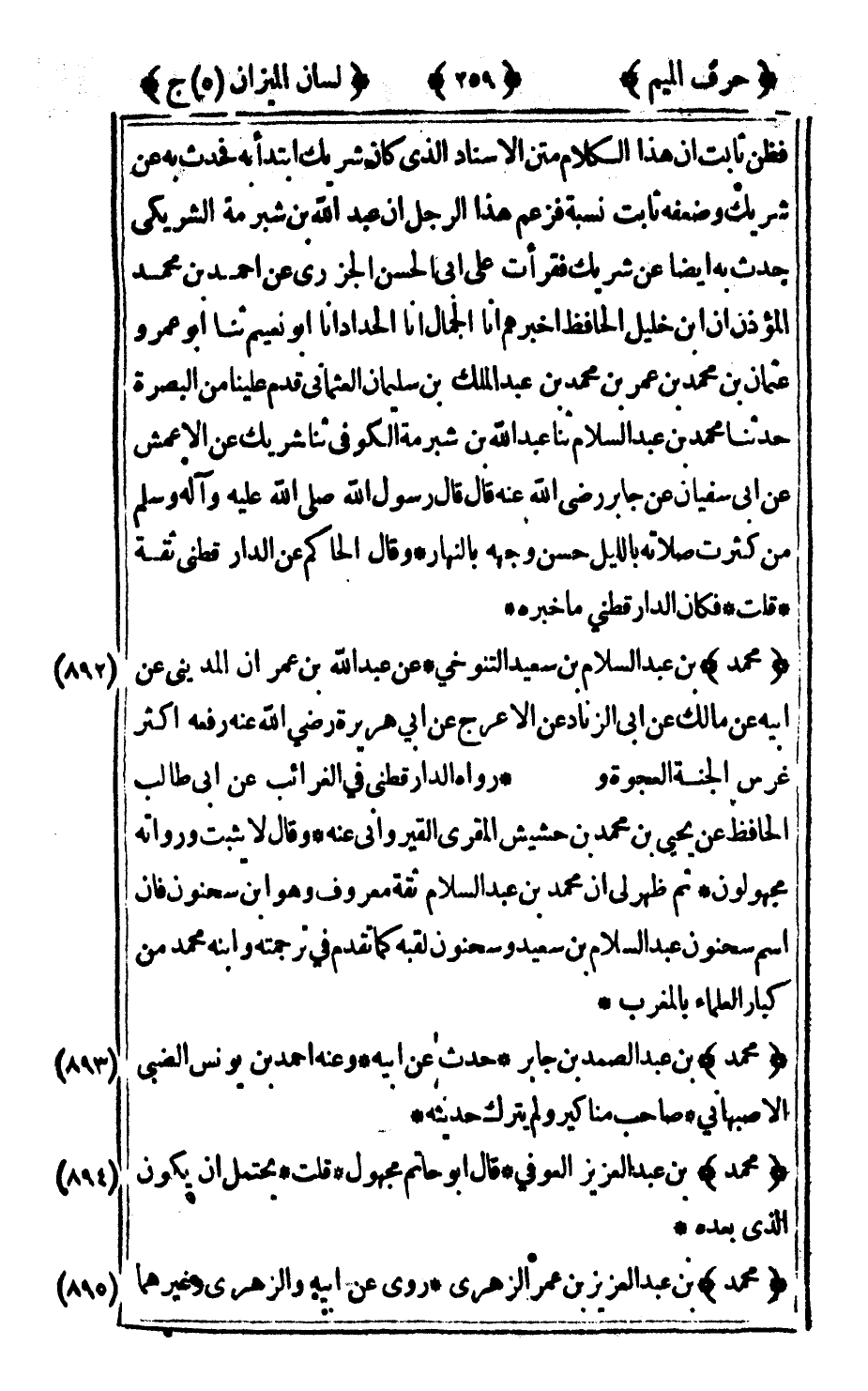 892 - "محمد" بن عبد السلام بن سعيد التنوخي عن عبد الله بن عمر أن المديني عن أبيه عن مالك عن أبي الزناد عن الأعرج عن أبي هريرة رضى الله عنه رفعه أكثر غرس الجنة العجوة ورواه الدارقطني في الغرائب عن أبي طالب الحافظ عن يحيى بن محمد بن حشيش المقري القيرواني عنه وقال: لا يثبت ورواته مجهولون ثم ظهر لي أن محمد بن عبد السلام ثقة معروف وهو ابن سحنون فإن اسم سحنون عبد السلام بن سعيد وسحنون لقبه كما تقدم في ترجمته وابنه محمد من كبار العلماء بالمغرب.