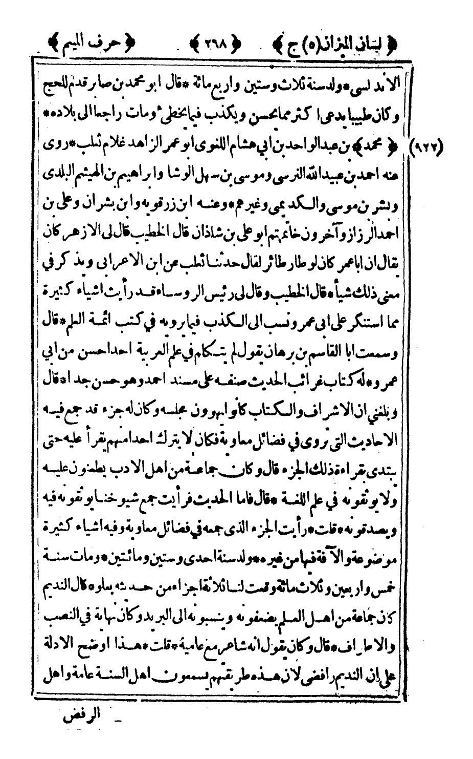 922 - "محمد" بن عبد الواحد بن أبي هشام اللغوي أبو عمر الزاهد غلام ثعلب روى عنه أحمد بن عبيد الله النرسي وموسى بن سهل الوشا وإبراهيم بن الهيثم البلدي وبشر بن موسى والكديمي وغيرهم وعنه ابن زرقويه وابن بشران وعلي بن أحمد الرزاز وآخرون خاتمتهم أبو علي بن شاذان قال الخطيب قال لي الأزهر كان يقال أنا أبا عمر كان لو طار طائر لقال حدثنا ثعلب عن ابن الأعرابي ويذكر في معنى ذلك شيئا قال الخطيب وقال لي رئيس الرؤساء قد رأيت أشياء كثيرة مما استنكر على أبي عمر ونسب إلى الكذب فيما يرويه في كتب أئمة العلم قال وسمعت أبا القاسم بن برهان يقول: لم يتكلم في علم العربية أحد أحسن من أبي عمرو له كتاب غرائب الحديث صنفه على مسند أحمد وهو حسن جدا قال وبلغني أن الإشراف والكتاب كانوا يهوون مجلسه وكان له جزء قد جمع فيه الأحاديث التي تروى في فضائل معاوية فكان لا يترك أحدا منهم يقرأعليه حتى يبتدي بقراءة ذلك الجزء قال وكان جماعة من أهل الأدب يطعنون عليه ولا يوثقونه في علم اللغة قال فأما الحديث فرأيت جمع شيوخنا يوثقونه فيه ويصدقونه قلت: رأيت الجزء الذي جمعه في فضائل معاوية وفيه أشياء كثيرة موضوعة والآفة فيها من غيره ولد سنة إحدى وستين ومائتين ومات سنة خمس وأربعين وثلاث مائة وقعت لنا ثلاثة أجزاء من حديثه بعلو قال النديم كان جماعة من أهل العلم يضعفونه وينسبونه إلى البريد وكان نهاية في النصب والأطراف قال وكان يقول: إنه شاعر مع عامية قلت: هذا أوضح الأدلة على أن النديم رافضي لان هذه طريقتهم يسمون أهل السنة عامة وأهل