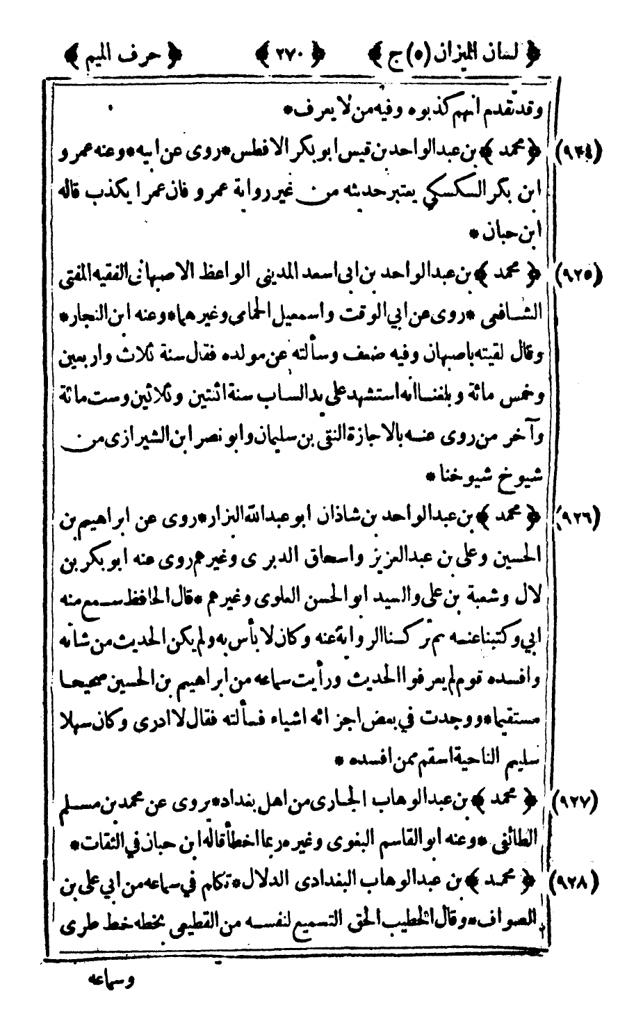 928 - "محمد" بن عبد الوهاب البغدادي الدلال تكلم في سماعه من أبي علي بن الصواف وقال الخطيب الحق التسميع لنفسه من القطيعي بخطه خط طري