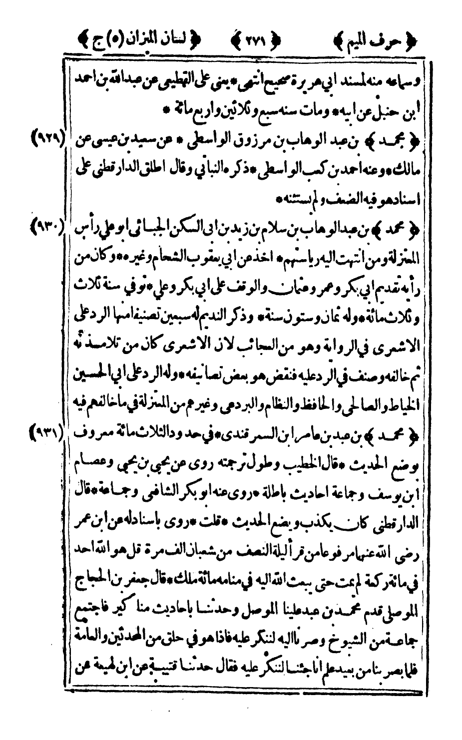 929 - "محمد" بن عبد الوهاب بن مرزوق الواسطي عن سعيد بن عيسى عن مالك وعنه أحمد بن كعب الواسطي ذكره النباتي وقال اطلق الدارقطني على إسناد هو فيه الضعف ولم يستثنه.