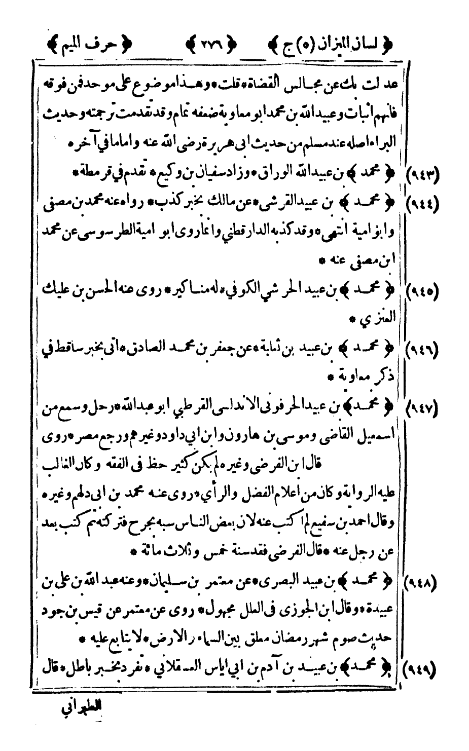 947 - "محمد" بن عبيد الحرفوني الأندلسي القرطبي أبو عبد الله رحل وسمع من إسماعيل القاضي وموسى بن هارون وابن أبي داود وغيرهم ورجع مصر روى قال ابن الفرضي وغيره لم يكن كثير حظ في الفقه وكان الغالب عليه الرواية وكان من اعلام الفضل والرأي روى عنه محمد بن أبي دلهم وغيره وقال أحمد بن سفيع لم اكتب عنه لان بعض الناس سبه بجرح فتركته ثم كتب بعد عن رجل عنه قال الفرضي فقد سنة خمس وثلاث مائة.