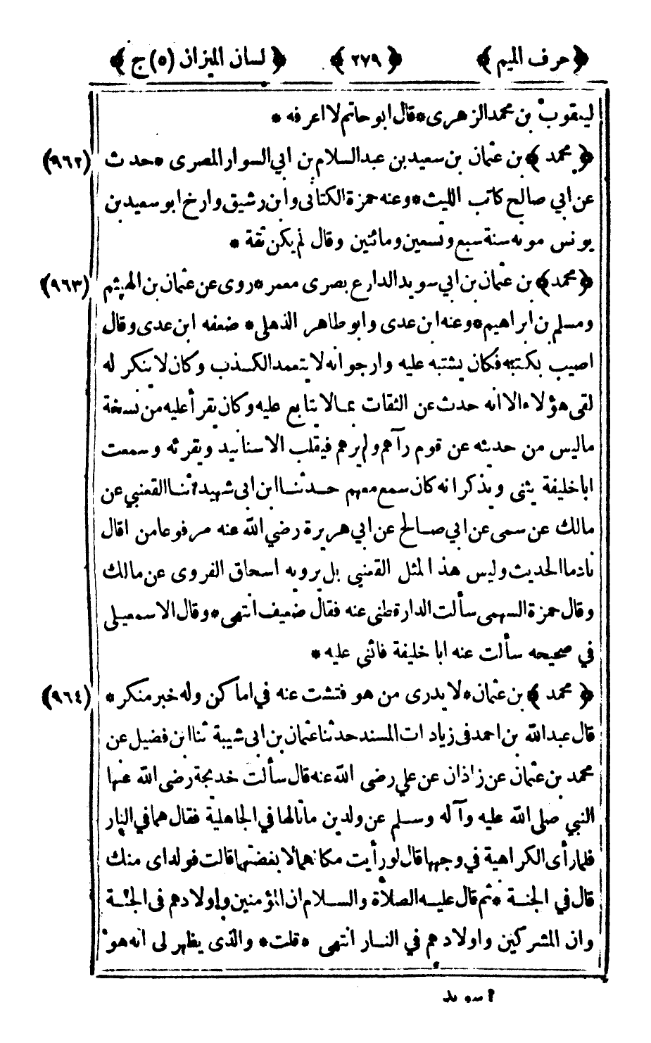 962 - "محمد" بن عثمان ابن سعيد بن عبد السلام بن أبي السوار المصري حدث عن أبي صالح كاتب الليث وعنه حمزة الكتاني وابن رشيق وأرخ أبو سعيد بن يونس موته سنة سبع وتسعين ومائتين وقال لم يكن ثقة.