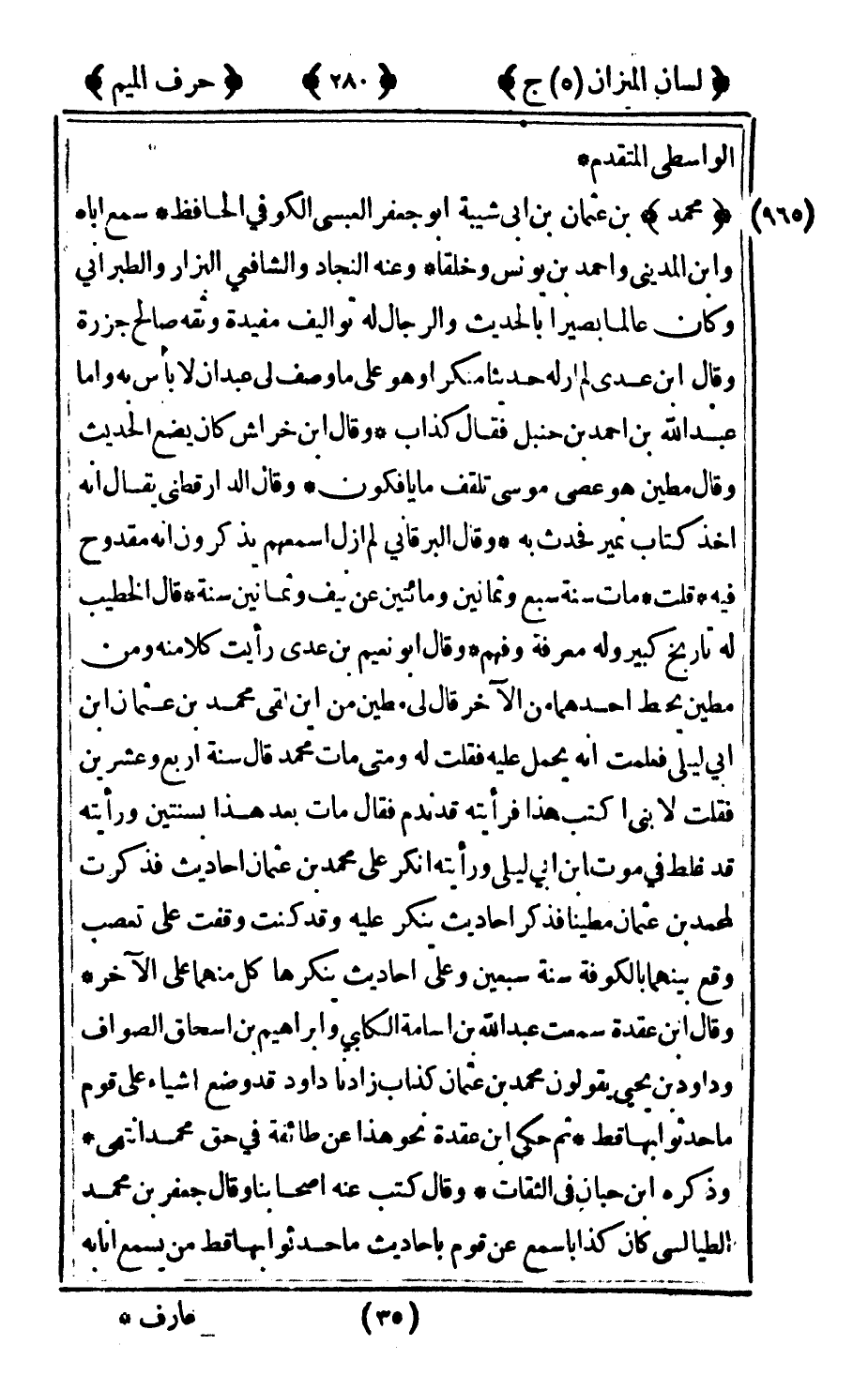 965 - "محمد" بن عثمان ابن أبي شيبة أبو جعفر العبسي الكوفي الحافظ سمع أباه وابن المديني وأحمد بن يونس وخلقا وعنه النجاد والشافعي البزار والطبراني وكان عالما بصيرا بالحديث والرجال له تواليف مفيدة وثقه صالح جزرة وقال ابن عدي: لم أر له حديثا منكرا وهو على ما وصف لي عبدان لا بأس به وأما عبد الله بن أحمد بن حنبل فقال: كذاب وقال ابن خراش كان يضع الحديث وقال مطين هو عصى موسى تلقف ما يأفكون وقال الدارقطني يقال أنه أخذ كتاب نمير فحدث به وقال البرقاني لم أزل أسمعهم يذكرون أنه مقدوح فيه قلت: مات سنة سبع وثمانين ومائتين عن نيف وثمانين سنة قال الخطيب له تاريخ كبير وله معرفة وفهم وقال أبو نعيم بن عدي رأيت كلا منه ومن مطين يحط أحدهما من الآخر قال لي مطين من أين لقي محمد بن عثمان ابن أبي ليلى فعلمت أنه يحمل عليه فقلت له ومتى مات محمد قال سنة أربع وعشرين فقلت لابني اكتب هذا فرأيته قد ندم فقال: مات بعد هذا بسنتين ورأيته قد غلط في موت بن أبي ليلى ورأيته انكر على محمد بن عثمان أحاديث فذكرت لمحمد بن عثمان مطينا فذكر أحاديث ينكر عليه وقد كنت وقفت على تعصب وقع بينهما بالكوفة سنة سبعين وعلى أحاديث ينكرها كل منهما على الآخر وقال ابن عقدة سمعت عبد الله بن أسامة الكلبي وإبراهيم بن إسحاق الصواف وداود بن يحيى يقولون محمد بن عثمان كذاب زادنا داود قد وضع أشياء على قوم ما حدثوا بها قط ثم حكى بن عقدة نحو هذا عن طائفة في حق محمد انتهى وذكره ابن حبان في الثقات وقال كتب عنه أصحابنا وقال جعفر بن محمد الطيالسي كان كذابا سمع عن قوم بأحاديث ما حدثوا بها قط من يسمع أنا به