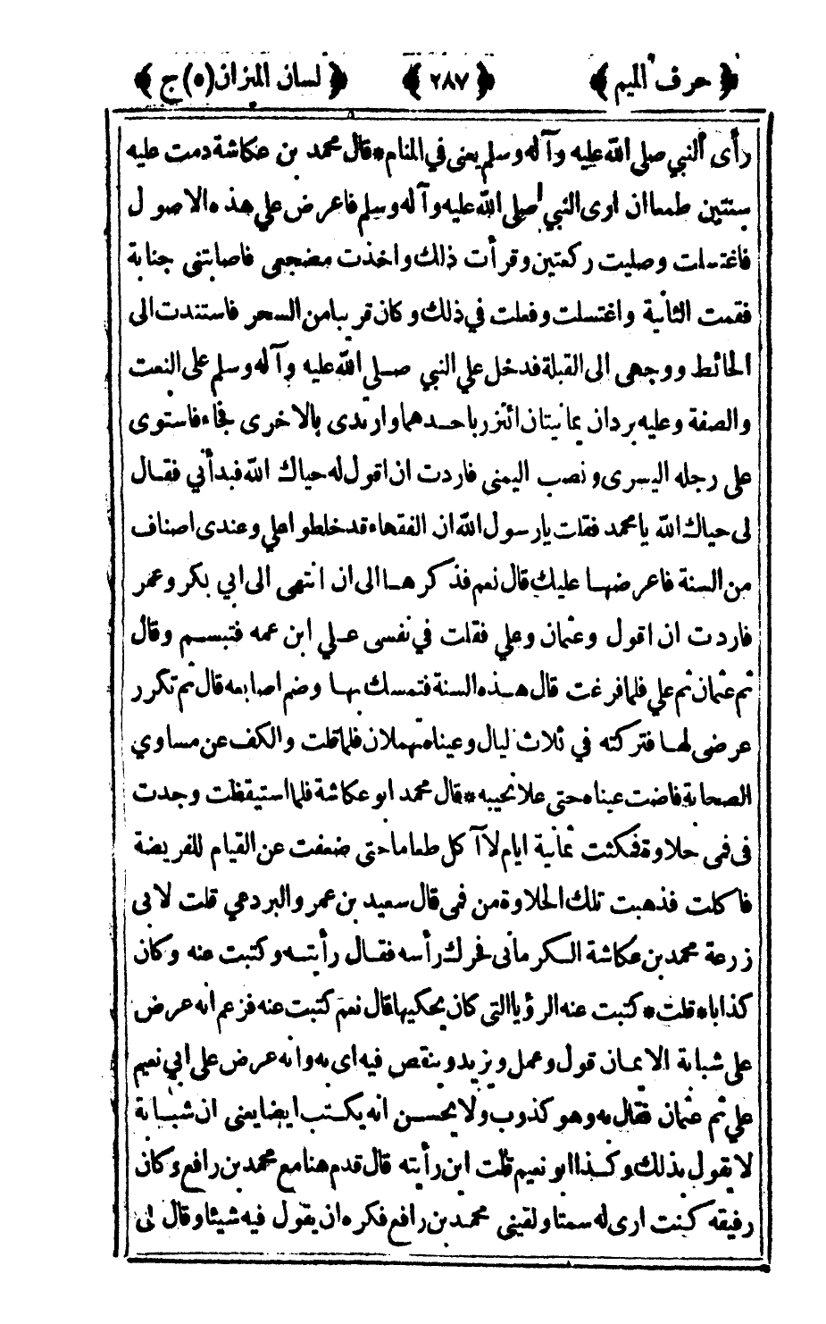 رأى النبي صلى الله عليه وآله وسلم يعني في المنام قال محمد بن عكاشة دمت عليه سنتين طمعا أن أرى النبي صلى الله عليه وآله وسلم فاعرض علي هذه الأصول فاغتسلت وصليت ركعتين وقرأت ذلك وأخذت مضجعي فاصابتني جنابة فقمت الثانية واغتسلت وفعلت في ذلك وكان قريبا من السحر فاستندت إلى الحائط ووجهي إلى القبله فدخل علي النبي صلى الله عليه وآله وسلم على النعت والصفة وعليه بردان يمانيتان ائتزر بأحدهما وارتدى بالأخرى فجاء فاستوى على رجله اليسرى ونصب اليمنى فأردت أن أقول له حياك الله فبدأني فقال لي: حياك الله يا محمد فقلت يا رسول الله أن الفقهاء قد خلطوا علي وعندي أصناف من السنة فاعرضها عليك قال نعم فذكرها إلى أن انتهى إلى أبي بكر وعمر فأردت أن أقول وعثمان وعلي فقلت في نفسي علي بن عمه فتبسم وقال ثم عثمان ثم علي فلما فرغت قال هذه السنة فتمسك بها وضم أصابعه قال ثم تكرر عرضي لها فتركته في ثلاث ليال وعيناه تهملان فلما قلت: والكف عن مساوي الصحابة فاضت عيناه حتى على نحيبه قال محمد أبو عكاشة فلما استيقظت وجدت في فمي حلاوة فمكثت ثمانية أيام لا آكل طعاما حتى ضعفت عن القيام للفريضة فأكلت فذهبت تلك الحلاوة من فمي قال سعيد بن عمرو البردعي قلت: لأبي زرعة محمد بن عكاشة الكرماني فحرك رأسه فقال: رأيته وكتبت عنه وكان كذابا قلت: كتبت عنه الرؤيا التي كان يحكيها قال نعم كتبت عنه فزعم أنه عرض على شبابة الإيمان قول وعمل ويزيد وينقص فيه أي به وانه عرض على أبي نعيم علي ثم عثمان فقال: به وهو كذوب ولا يحسن أنه يكتب أيضا يعني أن شبابة لا يقول: بذلك وكذا أبو نعيم قلت: أين رأيته قال قدم هنا مع محمد بن رافع وكان رفيقه كنت أرى له سمتا ولقيني محمد بن رافع فكره أن يقول: فيه شيئا وقال لي