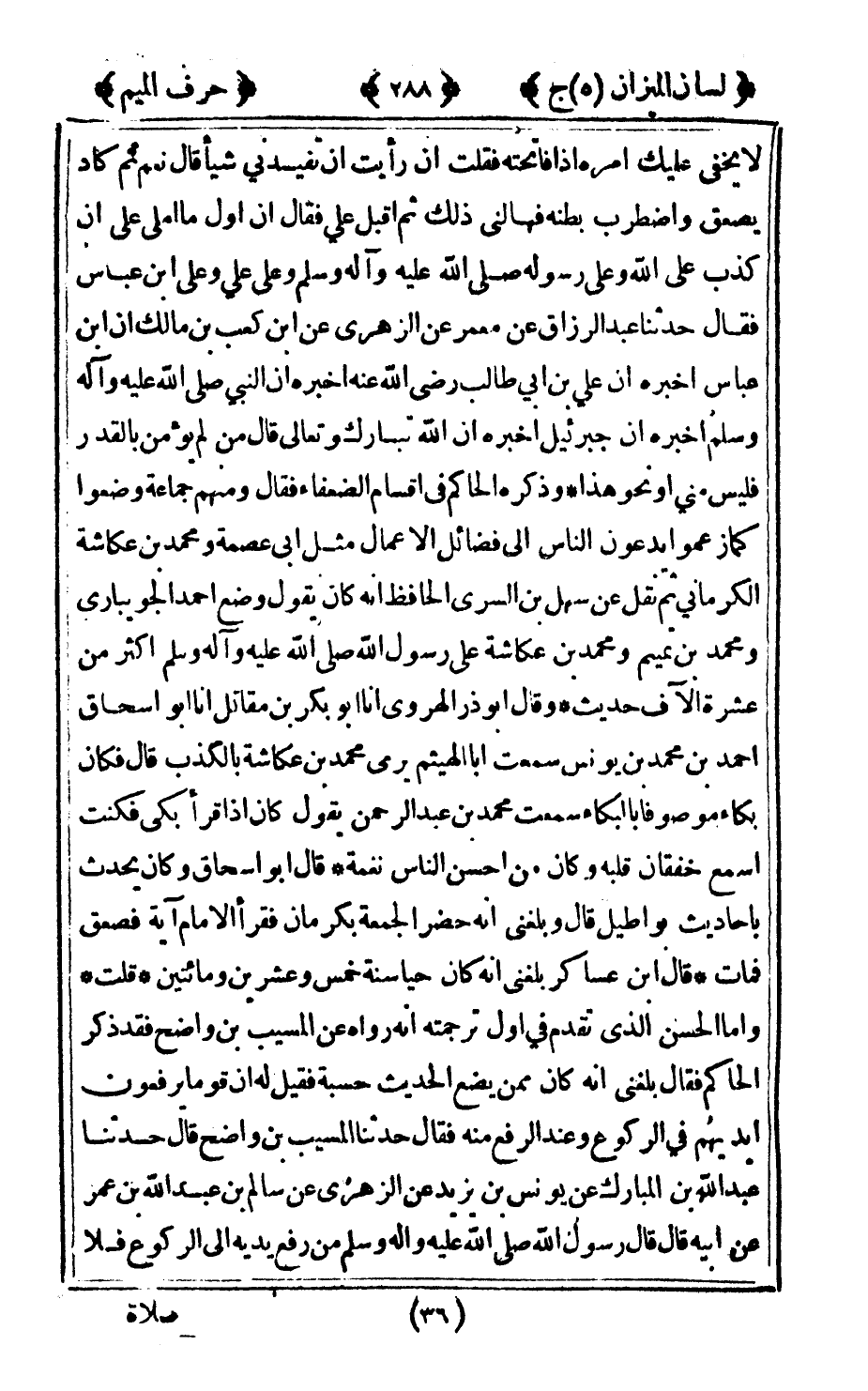 لا يخفى عليك امره إذا فاتحته فقلت إن رأيت أن تفيدني شيئا قال نعم ثم كاد يصعق واضطرب بطنه فهالني ذلك ثم اقبل علي فقال: إن أول ما أملى علي أن كذب على الله وعلى رسوله صلى الله عليه وآله وسلم وعلى علي وعلى بن عباس فقال: حدثنا عبد الرزاق عن معمر عن الزهري عن ابن كعب بن مالك أن ابن عباس أخبره أن علي بن أبي طالب رضى الله عنه أخبره أن النبي صلى الله عليه وآله وسلم أخبره أن جبرائيل أخبره أن الله تبارك وتعالى قال من لم يؤمن بالقدر فليس مني أو نحو هذا وذكره الحاكم في أقسام الضعفاء فقال: ومنهم جماعة وضعوا كما زعموا يدعون الناس إلى فضائل الأعمال مثل أبي عصمة ومحمد بن عكاشة الكرماني ثم نقل عن سهل بن السري الحافظ أنه كان يقول: وضع أحمد الجويباري ومحمد بن تميم ومحمد بن عكاشة على رسول الله صلى الله عليه وآله وسلم أكثر من عشرة الآف حديث وقال أبو ذر الهروي أنا أبو بكر بن مقاتل أنا أبو إسحاق أحمد بن محمد بن يونس سمعت أبا الهيثم يرمي محمد بن عكاشة بالكذب قال فكان بكاء موصوفا بالبكاء سمعت محمد بن عبد الرحمن يقول: كان إذا قرأ بكى فكنت أسمع خفقان قلبه وكان من أحسن الناس نغمة قال أبو إسحاق وكان يحدث بأحاديث بواطيل قال وبلغني أنه حضر الجمعة بكرمان فقرأ الامام آية فصعق فمات قال ابن عساكر بلغني أنه كان حيا سنة خمس وعشرين ومائتين قلت: وأما الحسن الذي تقدم في أول ترجمته أنه رواه عن المسيب بن واضح فقد ذكر الحاكم فقال: بلغني أنه كان ممن يضع الحديث حسبة فقيل له أن قوما يرفعون أيديهم في الركوع وعند الرفع منه فقال: حدثنا المسيب بن واضح قال حدثنا عبد الله بن المبارك عن يونس بن يزيد عن الزهري عن سالم عن عبد الله بن عمر عن أبيه قال: قال رسول الله صلى الله عليه وآله وسلم من رفع يديه إلى الركوع فلا