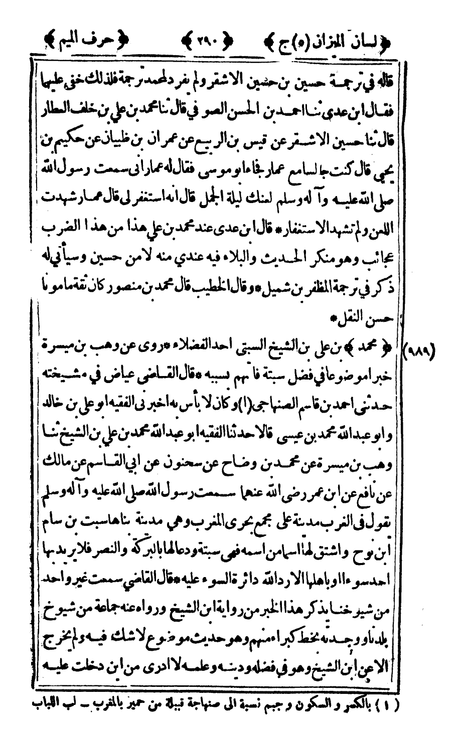 989 - "محمد" بن علي بن الشيخ السبتي أحد الفضلاء روى عن وهب بن ميسرة خبرا موضوعا في فضل سبتة فاتهم بسببه قال القاضي عياض في مشيخته حدثني أحمد بن قاسم الصنهاجي1 وكان لا باس به أخبرني الفقيه أبو علي بن خالد وأبو عبد الله محمد بن عيسى قالا حدثنا الفقيه أبو عبد الله محمد بن علي بن الشيخ ثنا وهب بن ميسرة عن محمد بن وضاح عن سحنون عن أبي القاسم عن مالك عن نافع عن ابن عمر رضى الله عنهما سمعت رسول الله صلى الله عليه وآله وسلم يقول: في الغرب مدينة على مجمع بحري المغرب وهي مدينة بناها سبت بن سام بن نوح واشتق لها اسما من اسمه في سبتة ودعا لها بالبركة والنصر فلا يريد بها أحد سوءا أو بأهلها إلا رد الله دائرة السوء عليه قال القاضي سمعت غير واحد من شيوخنا يذكر هذا الخبر من رواية بن الشيخ ورواه عنه جماعة من شيوخ بلدنا ووجدته بخط كبراء منهم وهو حديث موضوع لا شك فيه ولم يخرج إلا عن ابن الشيخ وهو في فضله ودينه وعلمه لا أدري من أين دخلت عليه