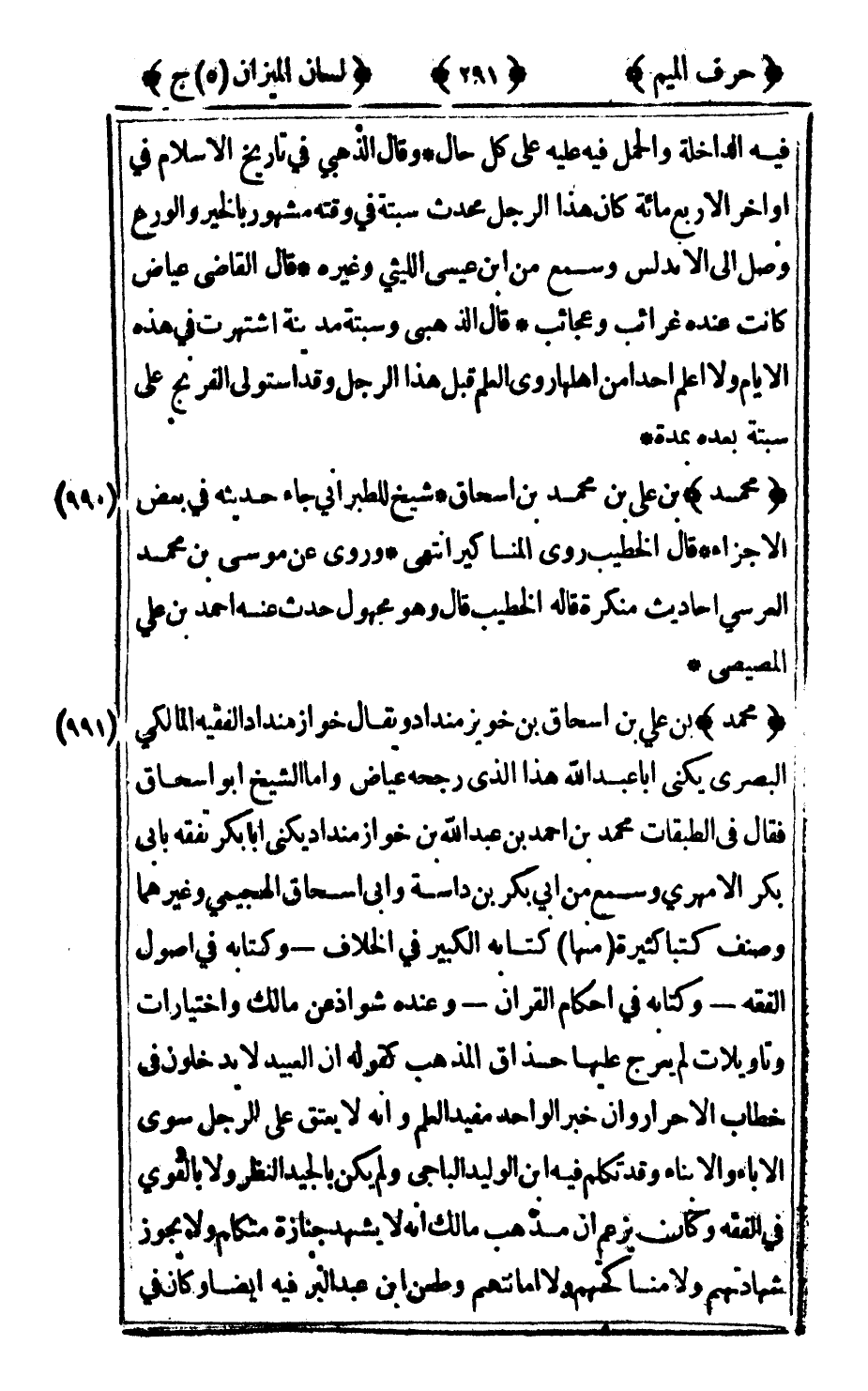 991 - "محمد" بن علي بن إسحاق بن خويز منداد ويقال خوازمنداد الفقيه المالكي البصري يكنى أبا عبد الله هذا الذي رجحه عياض وأما الشيخ أبو إسحاق فقال في الطبقات محمد بن أحمد بن عبد الله بن خوازمنداد يكنى أبا بكر تفقه بأبي بكر الامهري وسمع من أبي بكر بن داسة وأبي إسحاق الهجيمي وغيرهما وصنف كتبا كثيرة منها كتابه الكبير في الخلاف وكتابه في أصول الفقه وكتابه في أحكام القرآن وعنده شواذ عن مالك واختيارات وتأويلات لم يعرج عليها حذاق المذهب كقوله إن العبيد لا يدخلون في خطاب الأحرار وأن خبر الواحد مفيد العلم وانه لا يعتق على الرجل سوى الإباء والابناء وقد تكلم فيه بن الوليد الباجي ولم يكن بالجيد النظر ولا بالقوي في الفقه وكان يزعم أن مذهب مالك أنه لا يشهد جنازة متكلم ولا يجوز شهادتهم ولا مناكحتهم ولا امانتهم وطعن ابن عبد البر فيه أيضا وكان في