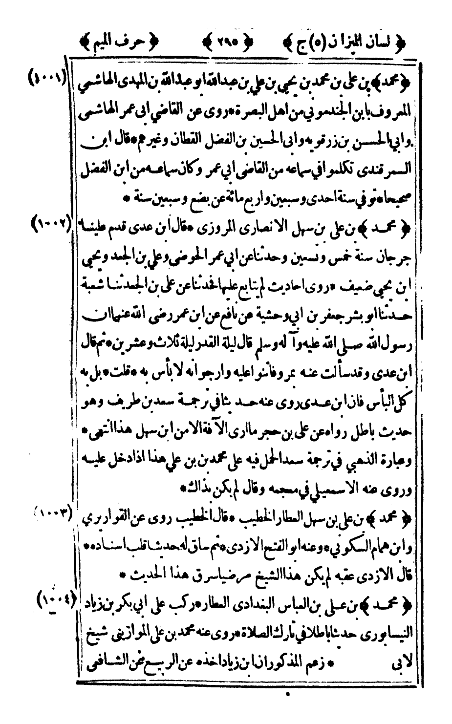 1001 - "محمد" بن علي بن محمد بن يحيى بن علي بن عبد الله أبو عبد الله بن المهدي الهاشمي المعروف بابن الجندموني من أهل البصرة روى عن القاضي أبي عمر الهاشمي وأبي الحسن بن رزقويه وأبي الحسين بن الفضل القطان وغيرهم قال ابن السمرقندي تكلموا في سماعه من القاضي أبي عمر وكان سماعه من بن الفضل صحيحا توفي سنة إحدى وسبعين وأربع مائة عن بضع وسبعين سنة.