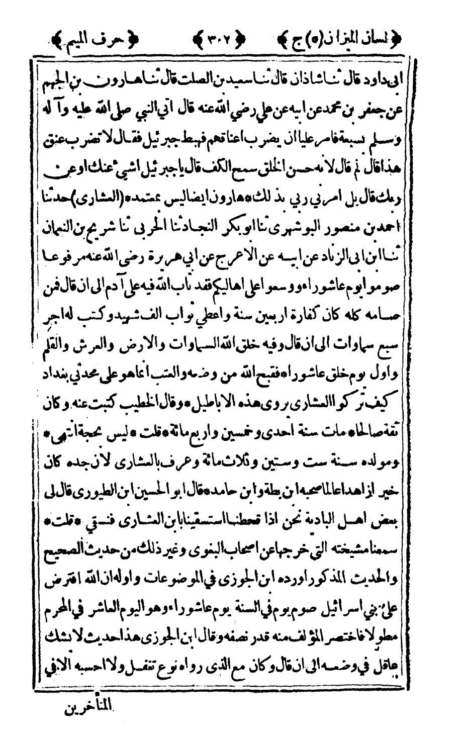 أبي داود قال ثنا شاذان قال ثنا سعيد بن الصلت قال ثنا هارون بن الجهم عن جعفر بن محمد عن أبيه عن علي رضى الله عنه قال أتى النبي صلى الله عليه وآله وسلم بسبعة فأمر عليا أن يضرب أعناقهم فهبط جبرائيل فقال: لا تضرب عنق هذا قال لم قال لأنه حسن الخلق سمح الكف قال يا جبرائيل اشيء عنك أو عن ربك قال بل أمرني ربي بذلك هارون أيضا ليس بمعتمد العشاري حدثنا أحمد بن منصور البوشهري ثنا أبو بكر النجاد ثنا الحربي ثنا شريح بن النعمان ثنا بن أبي الزناد عن أبيه عن الأعرج عن أبي هريرة رضى الله عنه مرفوعا صوموا يوم عاشوراء ووسعوا على أهاليكم فقد تاب الله فيه على آدم إلى أن قال فمن صامه كله كان كفارة أربعين سنة واعطي ثواب ألف شهيد وكتب له أجر سبع سماوات إلى أن قال وفيه خلق الله السماوات والأرض والعرش والقلم وأول يوم خلق عاشوراء فقبح الله من وضعه والعتب إنما هو على محدثي بغداد كيف تركوا العشاري يروي هذه الأباطيل وقال الخطيب كتبت عنه وكان ثقة صالحا مات سنة إحدى وخمسين وأربع مائة قلت: ليس بحجة انتهى ومولده سنة ست وستين وثلاث مائة وعرف بالعشاري لأن جده كان خيرا زاهدا عالما صحبه بن بطة وابن حامد قال أبو الحسين بن الطيوري قال لي بعض أهل البادية نحن إذا قحطنا استسقينا بابن العشاري فنسقي قلت: سمعنا مشيخته التي خرجها عن أصحاب البغوي وغير ذلك من حديث الصحيح والحديث المذكور أورده بن الجوزي في الموضوعات وأوله أن الله افترض على بني إسرائيل صوم يوم في السنة يوم عاشوراء وهو اليوم العاشر في المحرم مطولا فاختصر المؤلف منه قدر نصفه وقال ابن الجوزي هذا حديث لا يشك عاقل في وضعه إلى أن قال وكان مع الذي رواه نوع تغفل ولا أحسبه إلا في