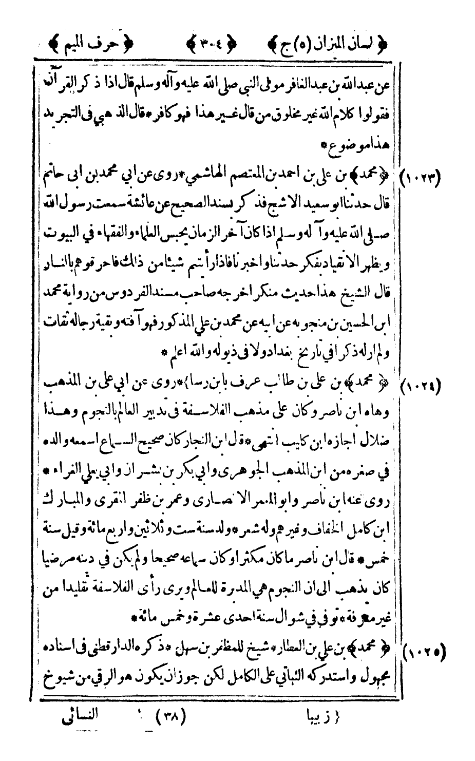 1023 - "محمد" بن علي بن أحمد بن المعتصم الهاشمي روى عن أبي محمد بن أبي حاتم قال حدثنا أبو سعيد الأشج فذكر بسند الصحيح عن عائشة سمعت رسول الله صلى الله عليه وآله وسلم إذا كان آخر الزمان يحبس العلماء والفقهاء في البيوت ويظهر الإنقياد بفكر حدثنا وأخبرنا فإذا رأيتم شيئا من ذلك فاحرقوهم بالنار قال الشيخ هذا حديث منكر أخرجه صاحب مسند الفردوس من رواية محمد بن الحسين بن منجوبه عن أبيه عن محمد بن علي المذكور فهو آفته وبقية رجاله ثقات ولم أر له ذكرا في تاريخ بغداد ولا في ذيوله والله أعلم.