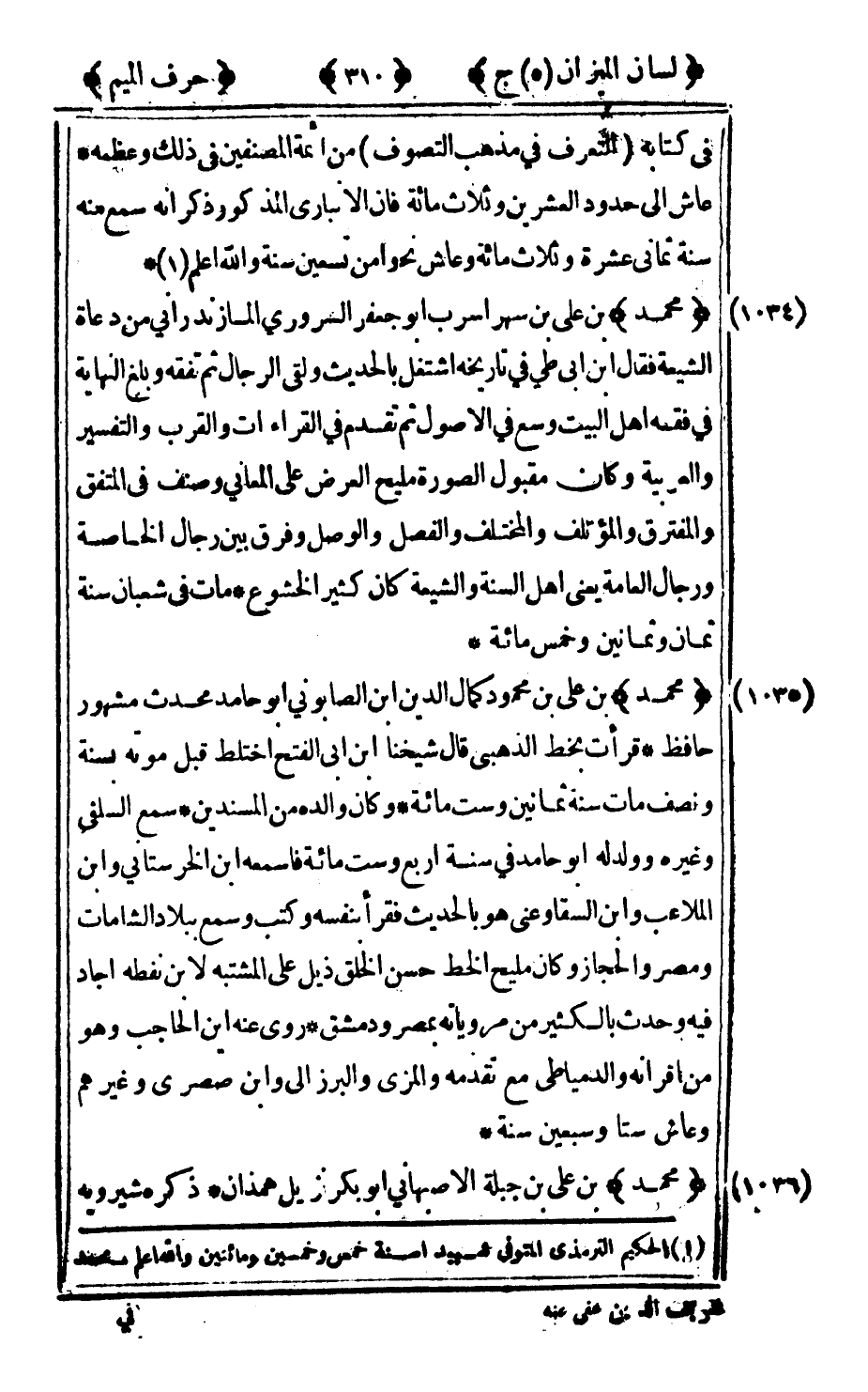 1034 - "محمد" بن علي بن شهر اشوب أبو جعفر السروري المازندراني من دعاة الشيعة فقال ابن أبي طي في تاريخه: اشتغل بالحديث ولقي الرجال ثم تفقه وبلغ النهاية في فقه أهل البيت وسع في الأصول ثم تقدم في القراءات والقرب والتفسير والعربية وكان مقبول الصورة مليح العرض على المعاني وصنف في المتفق والمفترق والمؤتلف والمختلف والفصل والوصل وفرق بين رجال الخاصة ورجال العامة يعني أهل السنة والشيعة كان كثير الخشوع مات في شعبان سنة ثمان وثمانين وخمس مائة.