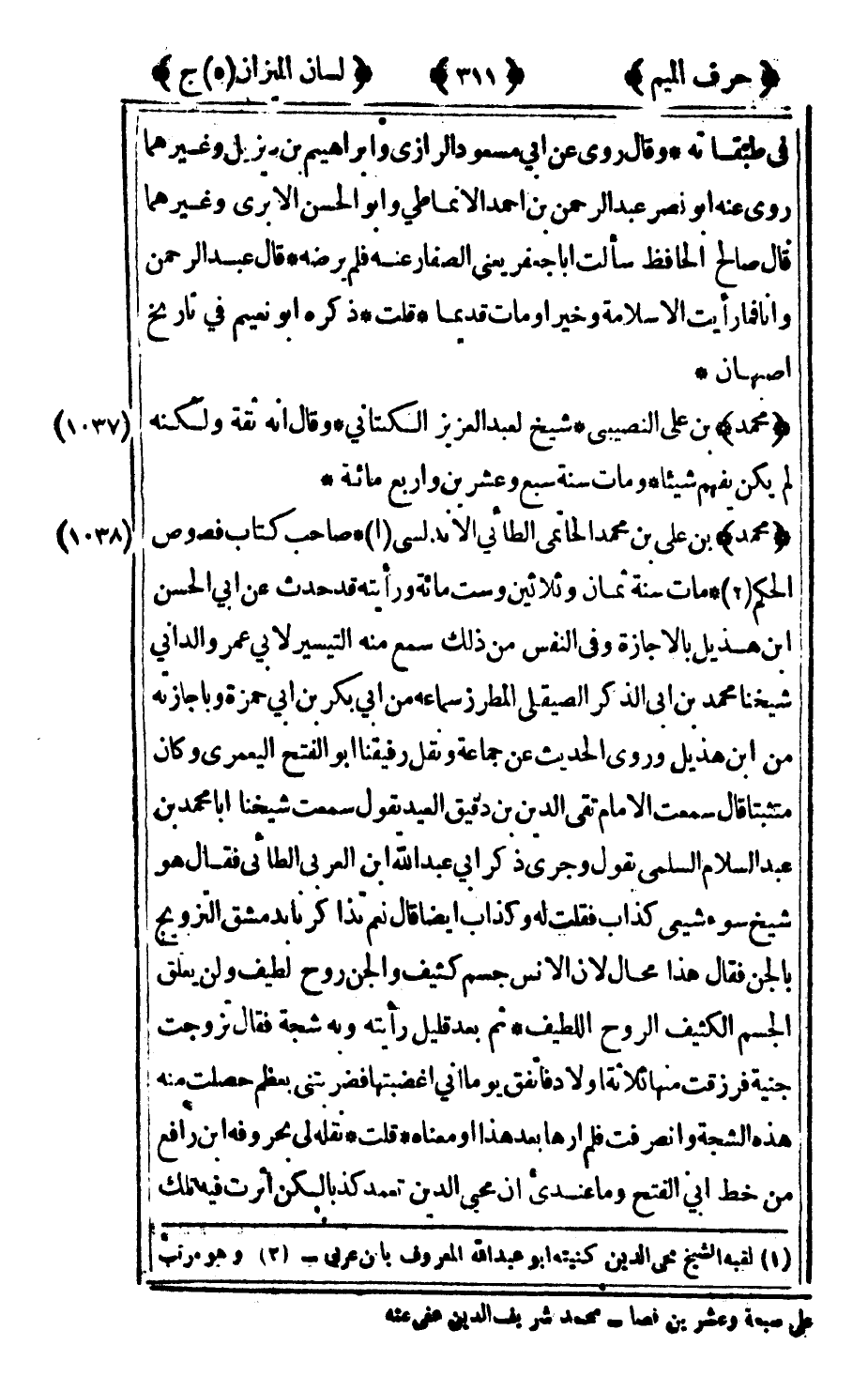 1037 - "محمد" بن علي النصيبي شيخ لعبد العزيز الكتاني وقال إنه ثقة ولكنه لم يكن يفهم شيئا ومات سنة سبع وعشرين وأربع مائة.