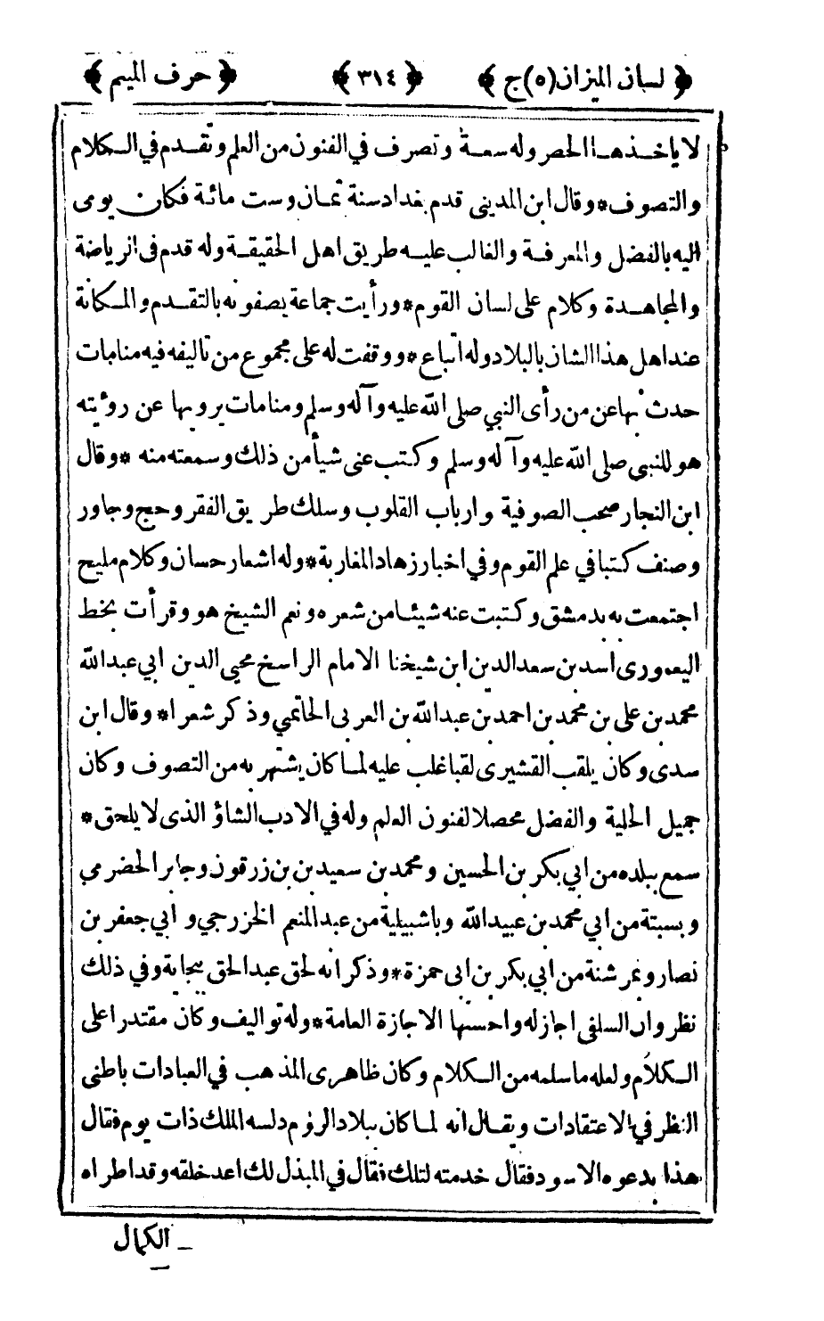 لا يأخذها الحصر وله سعة وتصرف في الفنون من العلم وتقدم في الكلام والتصوف وقال ابن المديني قدم بغداد سنة ثمان وست مائة فكان يومى إليه بالفضل والمعرفة والغالب عليه طريق أهل الحقيقة وله قدم في الرياضة والمجاهدة وكلام على لسان القوم ورأيت جماعة يصفونه بالتقدم والمكانة عند أهل هذا الشان بالبلاد وله اتباع ووقفت له على مجموع من تأليفه فيه منامات حدث بها عن من رأى النبي صلى الله عليه وآله وسلم ومنامات يرويها عن رؤيته هو للنبي صلى الله عليه وآله وسلم وكتب عني شيئا من ذلك وسمعته منه وقال ابن النجار صحب الصوفية وارباب القلوب وسلك طريق الفقر وحج وجاور وصنف كتبا في علم القوم وفي أخبار زهاد المغاربة وله اشعار حسان وكلام مليح اجتمعت به بدمشق وكتبت عنه شيئا من شعره ونعم الشيخ هو وقرأت بخط اليعموري أسد بن سعد الدين بن شيخنا الإمام الراسخ محيي الدين أبي عبد الله محمد بن علي بن محمد بن أحمد بن عبد الله بن العربي الحاتمي وذكر شعرا وقال ابن سدي وكان يلقب القشيري لقبا غلب عليه لما كان يشتهر به من التصوف وكان جميل الحلية والفضل محصلا لفنون العلم وله في الأدب الشاؤ الذي لا يلحق سمع ببلده من أبي بكر بن الحسين ومحمد بن سعيد بن زرقون وجابر الحضرمي وبسبتة من أبي محمد بن عبيد الله وباشبيلية من عبد المنعم الخزرجي وأبي جعفر بن نصار وبمرشنة من أبي بكر بن أبي حمزة وذكر أنه لحق عبد الحق ببجاية وفي ذلك نظر وإن السلفي أجاز له واحسنها الإجازة العامة وله تواليف وكان مقتدرا على الكلام ولعله ما سلمه من الكلام وكان ظاهري المذهب في العبادات باطني النظر في الإعتقادات ويقال إنه لما كان ببلاد الروم دلسه الملك ذات يوم فقال: هذا يدعوه الأسود فقال: خدمته لتلك فقال في المبذل: لك أعد خلقه وقد اطراه