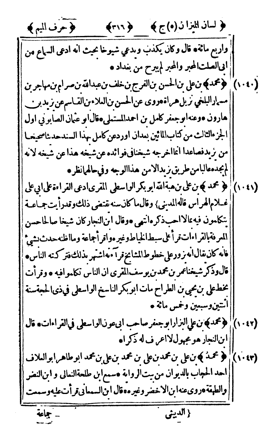 1042 - "محمد" بن علي البزار أبو جعفر صاحب أبي عون الواسطي في القراءات قال ابن النجار هو مجهول لا أعرف له ذكرا.