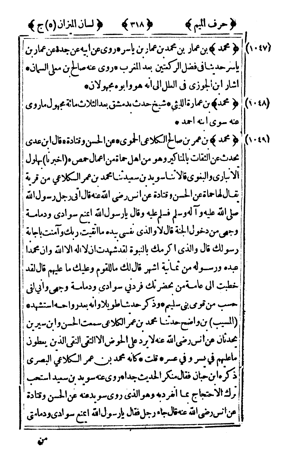 1049 - "محمد" بن عمر بن صالح الكلاعي الحموي عن الحسن وقتادة قال ابن عدي: يحدث عن الثقات بالمناكير وهو من أهل حماة من أعمال حمص أخبرنا بهلول الأنباري والبغوي قالا ثنا سويد بن سعيد ثنا محمد بن عمر الكلاعي من قرية يقال لها حماة عن الحسن وقتادة عن أنس رضى الله عنه قال أتى رجل رسول الله صلى الله عليه وآله وسلم فسلم عليه وقال يا رسول الله ايمنع سوادي ودمامة وجهي من دخول الجنة قال: لا والذي نفسي بيده ما اتقيت ربك وآمنت بإجابة رسولك قال والذي أكرمك بالنبوة لقد شهدت أن لا اله إلا الله وإن محمدا عبده ورسوله من ثمانية اشهر قال لك ما للقوم وعليك ما عليهم قال لقد خطبت إلى عامة من بحضرتك فردني سوادي ودمامة وجهي وأني لفي حسب من قومي بني سليم وذكر حديثا طويلا وأنه بعد رواحه استشهد المسيب بن واضح حدثنا محمد بن عمر الكلاعي سمعت الحسن وابن سيرين يحدثان عن أنس رضى الله عنه لا يرد على الحوض إلا التقي النقي الذين يعطون ما عليهم في يسر وفي عسر قلت: كأنه محمد بن عمر الكلاعي البصري ذكره ابن حبان فقال: منكر الحديث جدا روى عنه سويد بن سعيد استحب ترك الاحتجاج بما انفرد به وهو الذي روى سويد عنه عن الحسن وقتادة عن أنس رضى الله عنه قال جاء رجل فقال: يا رسول الله ايمنع سوادي ودمامتي