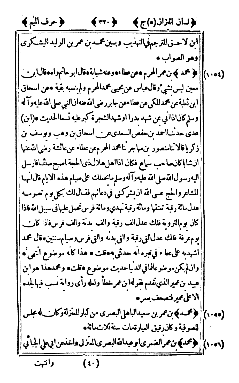 1054 - "محمد" بن عمر المحرم عن عطاء وعنه شبابة قال أبو حاتم واه قال ابن معين ليس بشيء وقال عباس عن يحيى محمد المحرم ولم ينسبه بقية عن إسحاق بن ثعلبة عن محمد المكي عن عطاء عن جابر رضى الله عنه أن النبي صلى الله عليه وآله وسلم كان إذا أتي بمن شهد بدرا أو شهد الشجرة كبر عليه تسعا الحديث ابن عدي حدثنا أحمد بن حفص السعدي عن إسحاق بن وهب ويوسف بن زكريا قالا ثنا منصور بن مهاجر ثنا محمد المحرم عن عطاء عن عائشة رضى الله عنها أن شابا كان صاحب سماع فكان إذا أهل هلال ذي الحجة أصبح صائما فأرسل إليه رسول الله صلى الله عليه وآله وسلم ما يحملك على صيام هذه الأيام قال انها المشاعر والحج عسى الله أن يشركني في دعائهم فقال: لك بكل يوم تصومه عدل مائة رقبة تعتقها ومائة رقبة تهدي ومائة فرس تحمل عليها في سبيل الله فإذا كان يوم التروية فلك عدل ألف رقبة والف بدنة والف فرس فإذا كان يوم عرفة فلك عدل الفي رقبة والفي بدنة والفي فرس وصيام سنتين قال محمد اشهد به على عطاء في قبره أنه حدثني به قلت: هذا كأنه موضوع انتهى وإن لم يكن موضوعا فما في الدنيا حديث موضوع قلت: ومحمد هذا هو ابن عبيد الله بن عبيد بن عمير الذي تقدم فقوله بن عمر خطأ ولعله رأى رواية نسب فيها لجده الأعلى عمير فتصحف بعمر.