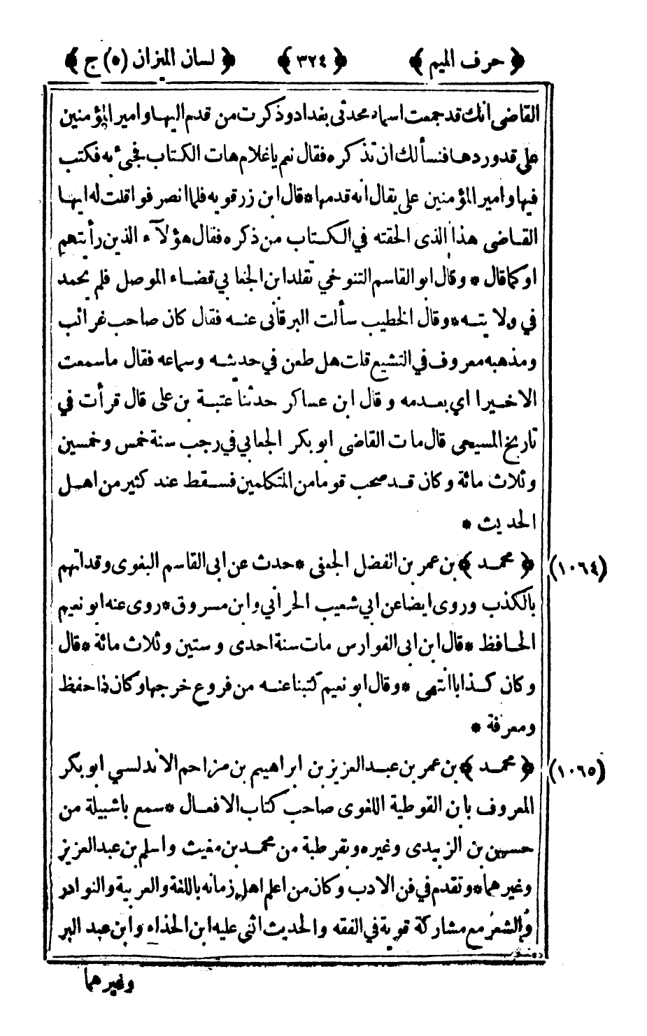 1065 - "محمد" بن عمر بن عبد العزيز بن إبراهيم بن مزاحم الأندلسي أبو بكر المعروف بابن القوطية اللغوي صاحب كتاب الأفعال سمع باشبيلة من حسن بن الزبيدي وغيره وبقرطبة من محمد بن مغيث واسلم بن عبد العزيز وغيرهما وتقدم في فن الأدب وكان من أعلم أهل زمانه باللغة والعربية والنوادر والشعر مع مشاركة قوية في الفقه والحديث اثنى عليه بن الحذاء وابن عبد البر