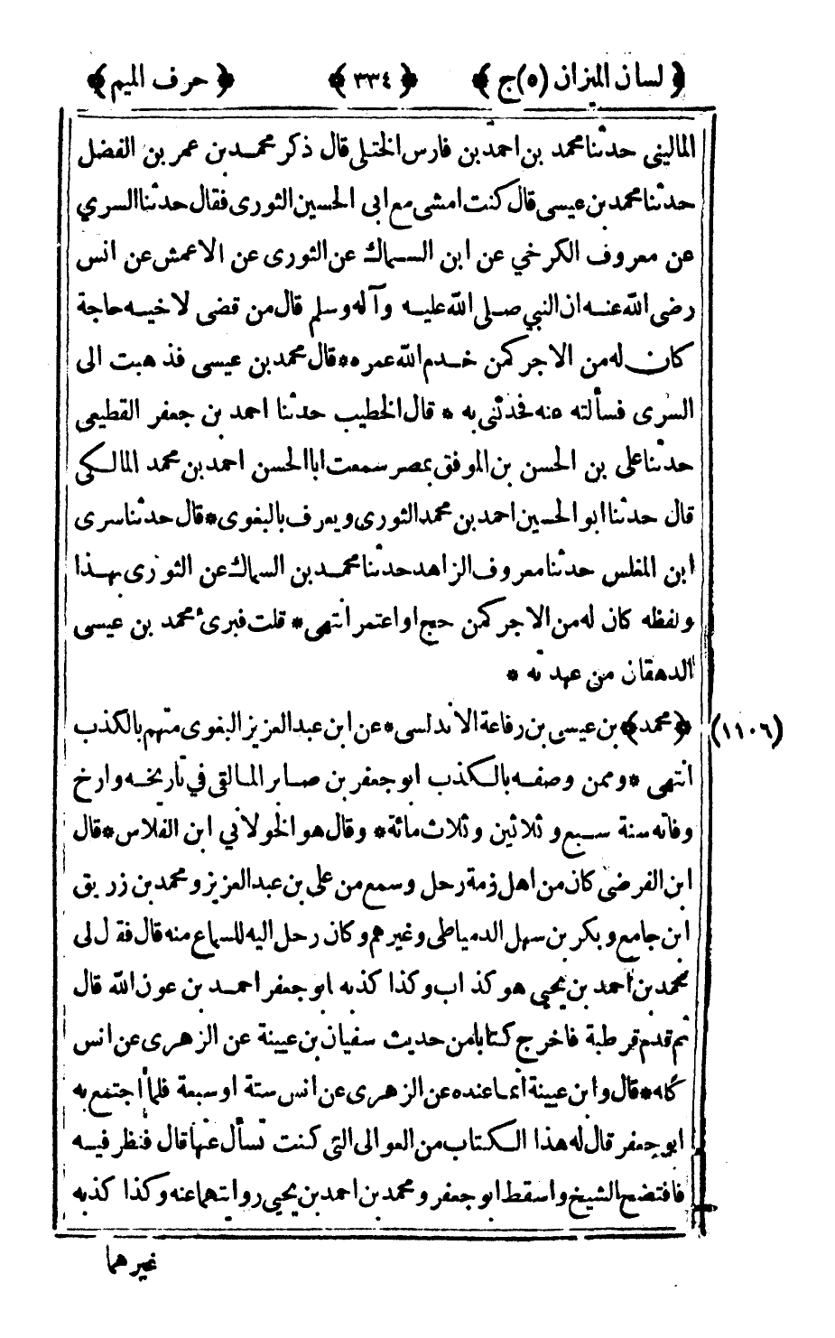 1106 - "محمد" بن عيسى بن رفاعة الأندلسي عن ابن عبد العزيز البغوي متهم بالكذب انتهى وممن وصفه بالكذب أبو جعفر بن صابر المالقي في تاريخه وأرخ وفاته سنة سبع وثلاثين وثلاث مائة وقال هو الخولاني بن الفلاس قال ابن الفرضي كان من أهل زمة رحل وسمع من علي بن عبد العزيز ومحمد بن زريق بن جامع وبكر بن سهل الدمياطي وغيرهم وكان رحل إليه للسماع منه قال فقال لي: محمد بن أحمد بن يحيى هو كذاب وكذا كذبه أبو جعفر أحمد بن عون الله قال ثم قدم قرطبة فاخرج كتابا من حديث سفي أن ابن عيينة عن الزهري عن أنس كله قال وابن عيينة إنما عنده عن الزهري عن أنس ستة أو سبعة فلما اجتمع به أبو جعفر قال له هذا الكتاب من العوالي التي كنت تسأل عنها قال فنظر فيه فافتضح الشيخ واسقط أبو جعفر ومحمد بن أحمد بن يحيى روايتهما عنه وكذا كذبه