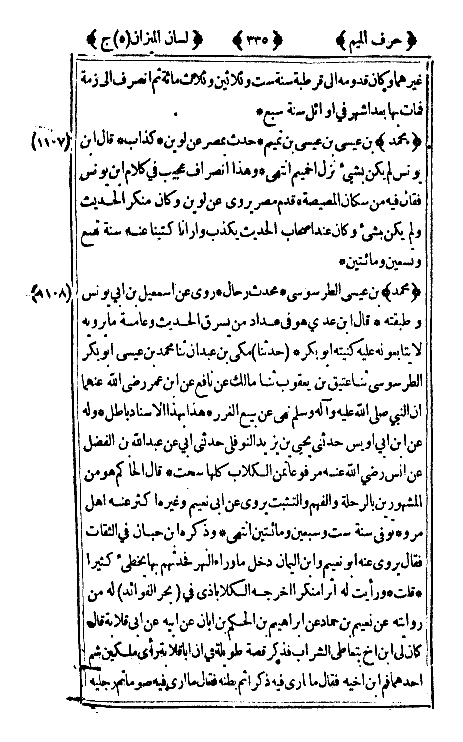 1107 - "محمد" بن عيسى بن تميم حدث بمصر عن لوين كذاب قال ابن يونس لم يكن بشيء نزل اخميم انتهى وهذا انصراف عجيب في كلام بن يونس فقال: فيه من سكان المصيصة قدم مصر يروي عن لوين وكان منكر الحديث ولم يكن بشيء وكان عند أصحاب الحديث يكذب وارانا كتبنا عنه سنة تسع وتسعين ومائتين.